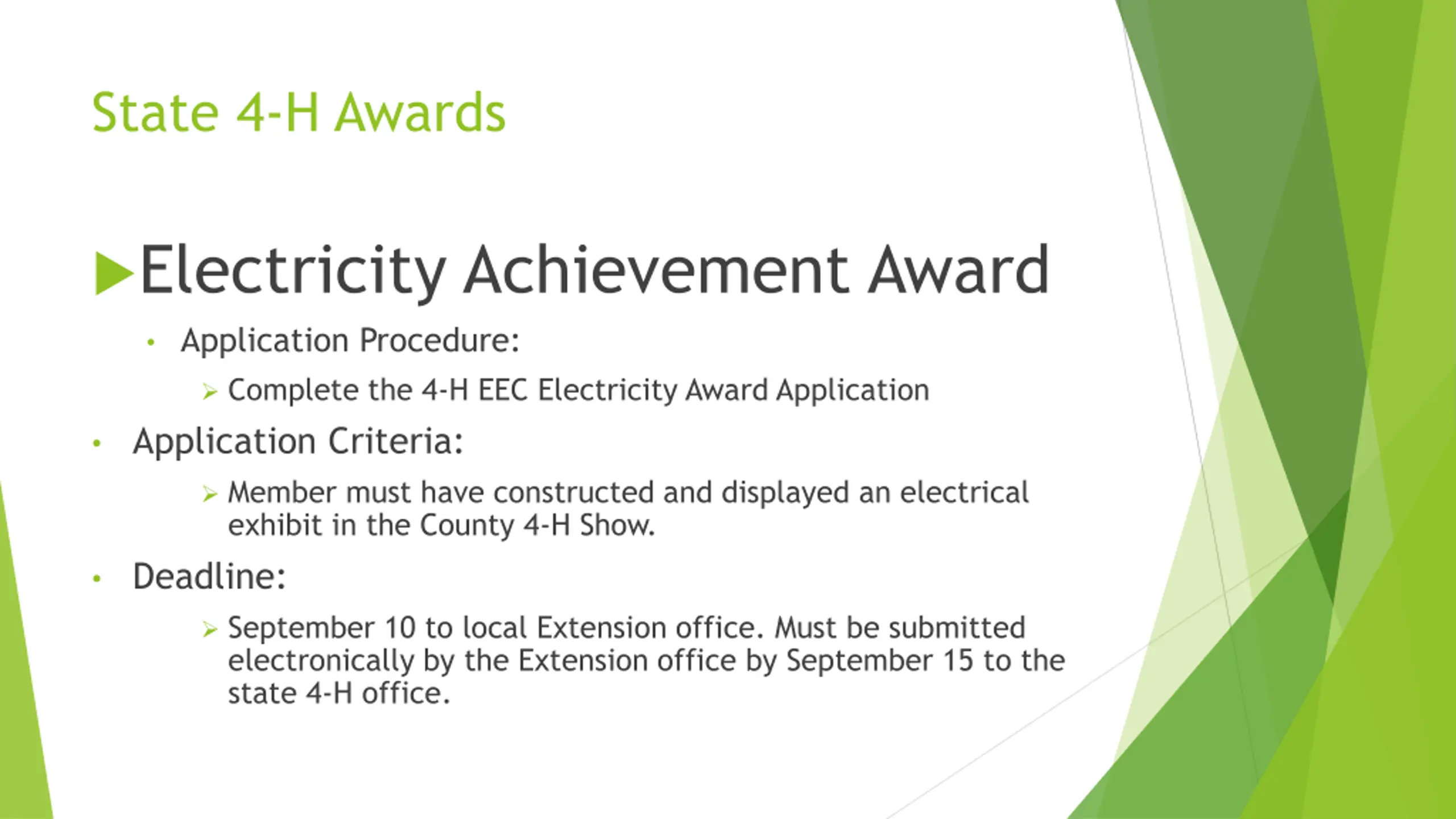 State 4-H Awards Electricity Achievement Award Application Procedure: Complete the 4-H EEC Electricity Award Application Application Criteria: Member must have constructed and displayed an electrical exhibit in the County 4-H Show. Deadline: September 10 to local Extension office. Must be submitted electronically by the Extension office by September 15 to the state 4-H office.