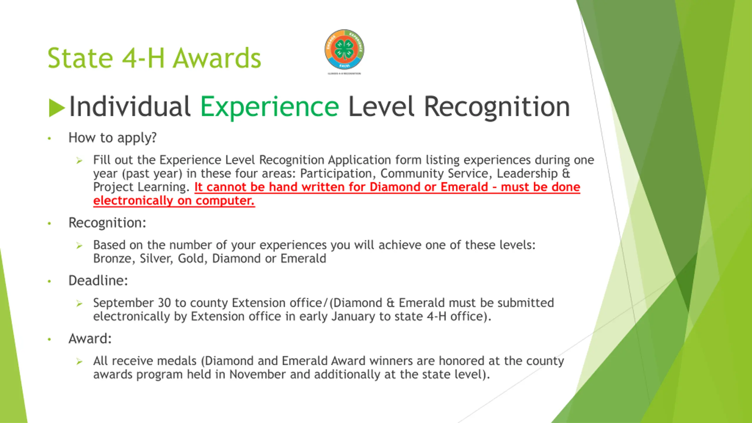 State 4-H Awards Individual Experience Level Recognition How to apply? Fill out the Experience Level Recognition Application form listing experiences during one year (past year) in these four areas: Participation, Community Service, Leadership & Project Learning. It cannot be hand written for Diamond or Emerald must be done electronically on computer. Recognition: Based on the number of your experiences you will achieve one of these levels: Bronze, Silver, Gold, Diamond or Emerald Deadline: September 30 to county Extension office/(Diamond & Emerald must be submitted electronically by Extension office in early January to state 4-H office). Award: All receive medals (Diamond and Emerald Award winners are honored at the county awards program held in November and additionally at the state level).