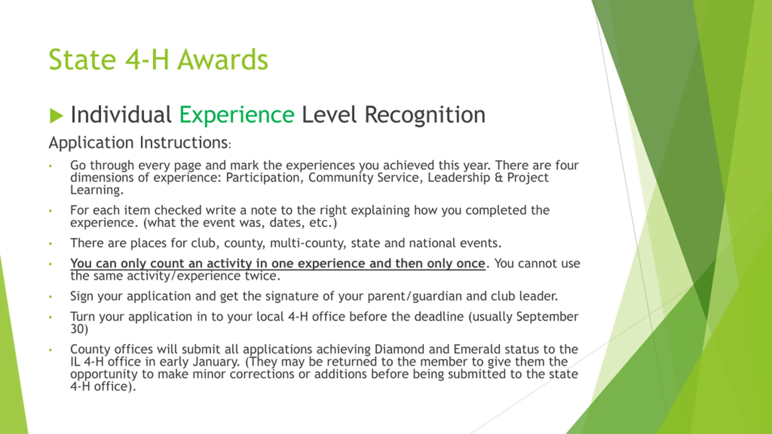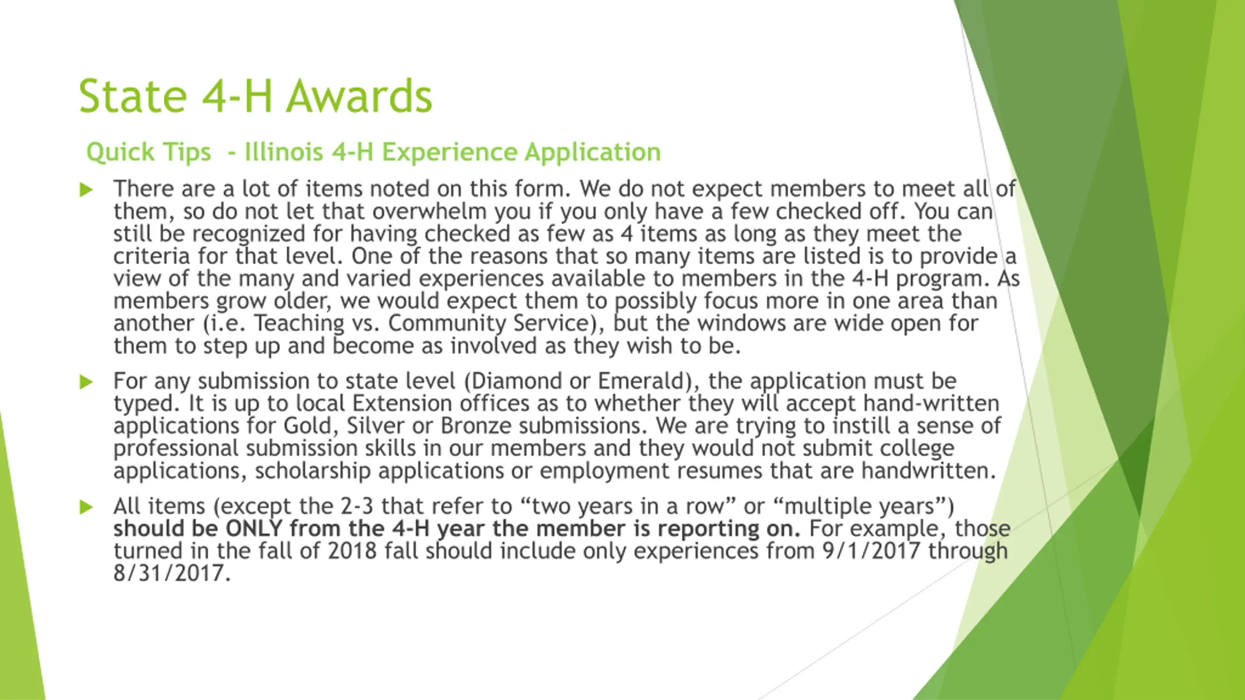 State 4-H Awards Quick Tips - Illinois 4-H Experience Application There are a lot of items noted on this form. We do not expect members to meet all of them, so do not let that overwhelm you if you only have a few checked off. You can still be recognized for having checked as few as 4 items as long as they meet the criteria for that level. One of the reasons that so many items are listed is to provide a view of the many and varied experiences available to members in the 4-H program. As members grow older, we would expect them to possibly focus more in one area than another (i.e. Teaching vs. Community Service), but the windows are wide open for them to step up and become as involved as they wish to be. For any submission to state level (Diamond or Emerald), the application must be typed. It is up to local Extension offices as to whether they will accept hand-written applications for Gold, Silver or Bronze submissions. We are trying to instill a sense of professional submission skills in our members and they would not submit college applications, scholarship applications or employment resumes that are handwritten. All items (except the 2-3 that refer to two years in a row or multiple years ) should be ONLY from the 4-H year the member is reporting on. For example, those turned in the fall of 2018 fall should include only experiences from 9/1/2017 through 8/31/2017.