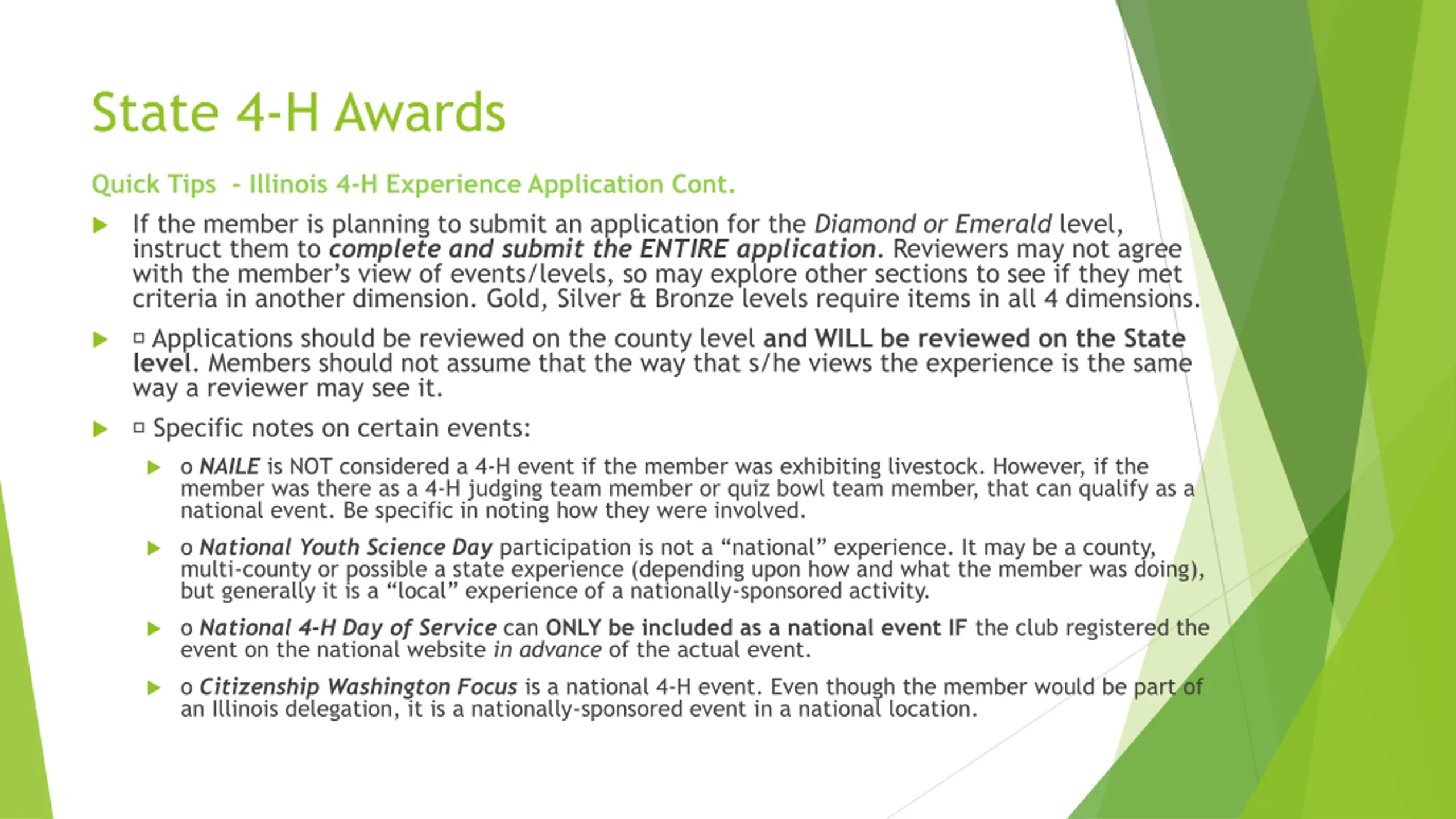 State 4-H Awards Quick Tips - Illinois 4-H Experience Application Cont. If the member is planning to submit an application for the Diamond or Emerald level, instruct them to complete and submit the ENTIRE application. Reviewers may not agree with the member s view of events/levels, so may explore other sections to see if they met criteria in another dimension. Gold, Silver & Bronze levels require items in all 4 dimensions. Applications should be reviewed on the county level and WILL be reviewed on the State level. Members should not assume that the way that s/he views the experience is the same way a reviewer may see it. Specific notes on certain events: o NAILE is NOT considered a 4-H event if the member was exhibiting livestock. However, if the member was there as a 4-H judging team member or quiz bowl team member, that can qualify as a national event. Be specific in noting how they were involved. o National Youth Science Day participation is not a national experience. It may be a county, multi-county or possible a state experience (depending upon how and what the member was doing), but generally it is a local experience of a nationally-sponsored activity. o National 4-H Day of Service can ONLY be included as a national event IF the club registered the event on the national website in advance of the actual event. o Citizenship Washington Focus is a national 4-H event. Even though the member would be part of an Illinois delegation, it is a nationally-sponsored event in a national location.