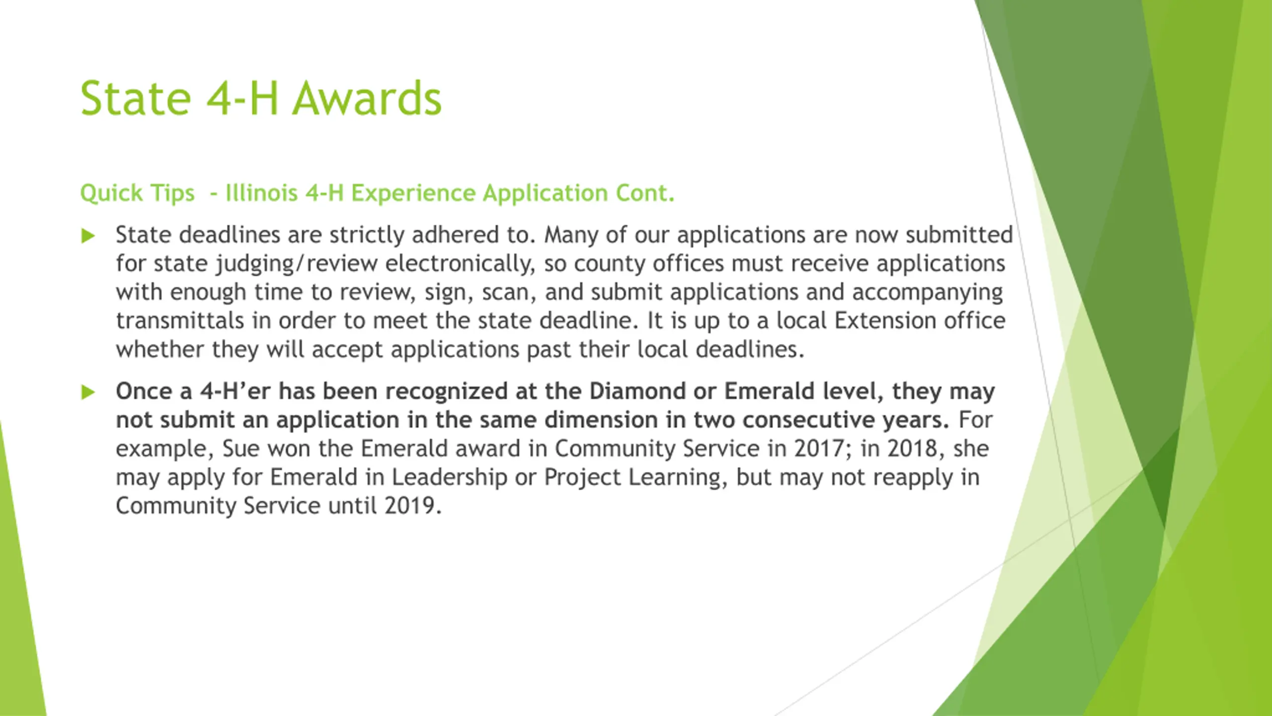 State 4-H Awards Quick Tips - Illinois 4-H Experience Application Cont. State deadlines are strictly adhered to. Many of our applications are now submitted for state judging/review electronically, so county offices must receive applications with enough time to review, sign, scan, and submit applications and accompanying transmittals in order to meet the state deadline. It is up to a local Extension office whether they will accept applications past their local deadlines. Once a 4-H er has been recognized at the Diamond or Emerald level, they may not submit an application in the same dimension in two consecutive years. For example, Sue won the Emerald award in Community Service in 2017; in 2018, she may apply for Emerald in Leadership or Project Learning, but may not reapply in Community Service until 2019.