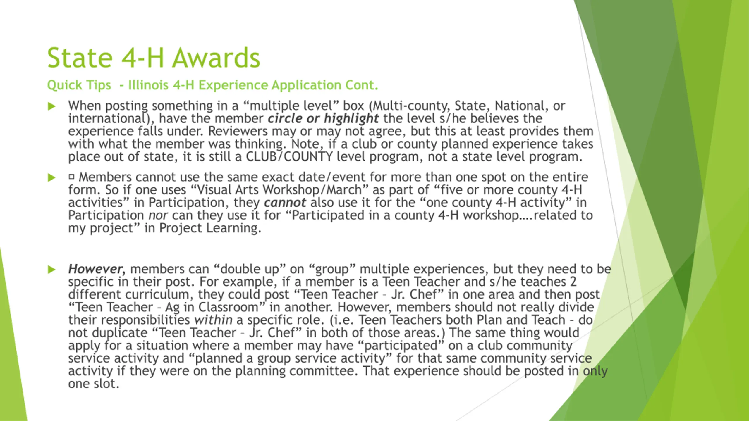 State 4-H Awards Quick Tips - Illinois 4-H Experience Application Cont. When posting something in a multiple level box (Multi-county, State, National, or international), have the member circle or highlight the level s/he believes the experience falls under. Reviewers may or may not agree, but this at least provides them with what the member was thinking. Note, if a club or county planned experience takes place out of state, it is still a CLUB/COUNTY level program, not a state level program. Members cannot use the same exact date/event for more than one spot on the entire form. So if one uses Visual Arts Workshop/March as part of five or more county 4-H activities in Participation, they cannot also use it for the one county 4-H activity in Participation nor can they use it for Participated in a county 4-H workshop .related to my project in Project Learning. However, members can double up on group multiple experiences, but they need to be specific in their post. For example, if a member is a Teen Teacher and s/he teaches 2 different curriculum, they could post Teen Teacher Jr. Chef in one area and then post Teen Teacher Ag in Classroom in another. However, members should not really divide their responsibilities within a specific role. (i.e. Teen Teachers both Plan and Teach do not duplicate Teen Teacher Jr. Chef in both of those areas.) The same thing would apply for a situation where a member may have participated on a club community service activity and planned a group service activity for that same community service activity if they were on the planning committee. That experience should be posted in only one slot.