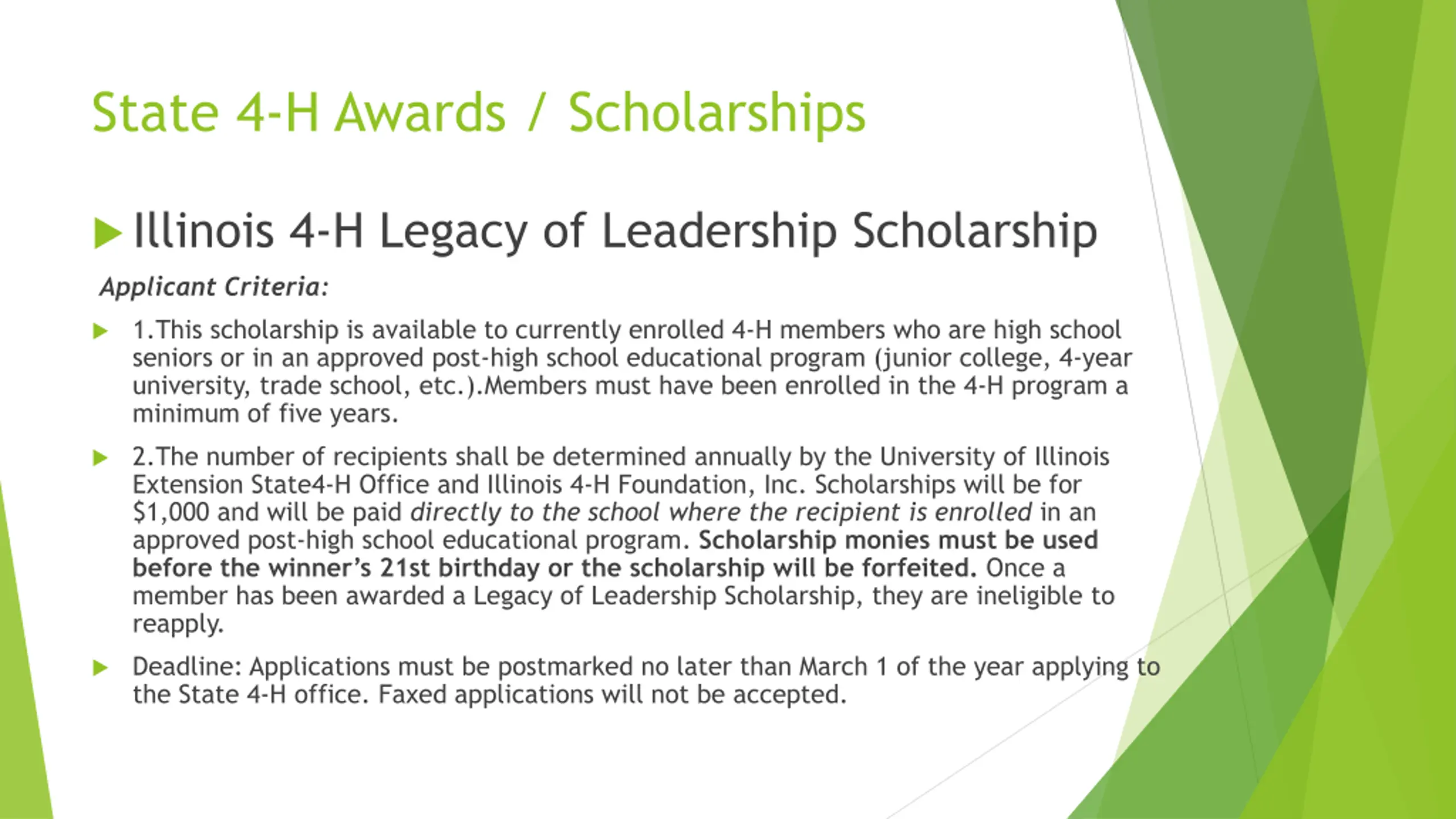 State 4-H Awards / Scholarships Illinois 4-H Legacy of Leadership Scholarship Applicant Criteria: 1.This scholarship is available to currently enrolled 4-H members who are high school seniors or in an approved post-high school educational program (junior college, 4-year university, trade school, etc.).Members must have been enrolled in the 4-H program a minimum of five years. 2.The number of recipients shall be determined annually by the University of Illinois Extension State4-H Office and Illinois 4-H Foundation, Inc. Scholarships will be for $1,000 and will be paid directly to the school where the recipient is enrolled in an approved post-high school educational program. Scholarship monies must be used before the winner s 21st birthday or the scholarship will be forfeited. Once a member has been awarded a Legacy of Leadership Scholarship, they are ineligible to reapply. Deadline: Applications must be postmarked no later than March 1 of the year applying to the State 4-H office. Faxed applications will not be accepted.
