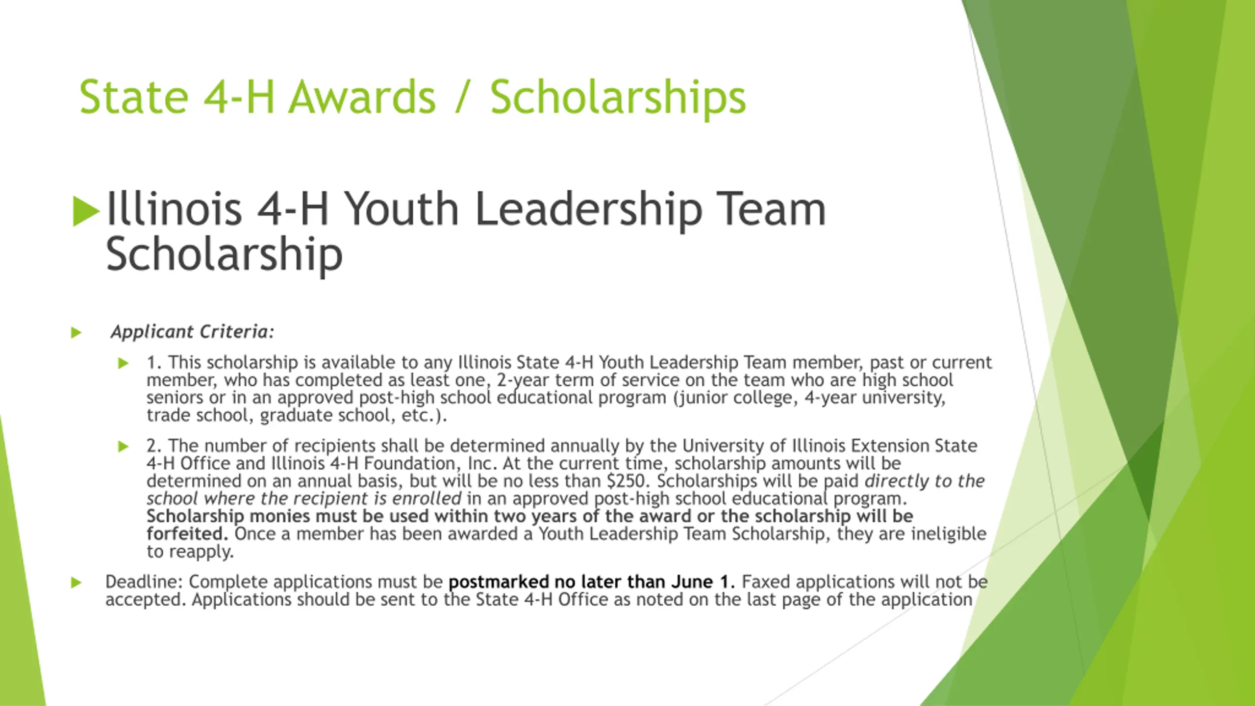 State 4-H Awards / Scholarships Illinois 4-H Youth Leadership Team Scholarship Applicant Criteria: 1. This scholarship is available to any Illinois State 4-H Youth Leadership Team member, past or current member, who has completed as least one, 2-year term of service on the team who are high school seniors or in an approved post-high school educational program (junior college, 4-year university, trade school, graduate school, etc.). 2. The number of recipients shall be determined annually by the University of Illinois Extension State 4-H Office and Illinois 4-H Foundation, Inc. At the current time, scholarship amounts will be determined on an annual basis, but will be no less than $250. Scholarships will be paid directly to the school where the recipient is enrolled in an approved post-high school educational program. Scholarship monies must be used within two years of the award or the scholarship will be forfeited. Once a member has been awarded a Youth Leadership Team Scholarship, they are ineligible to reapply. Deadline: Complete applications must be postmarked no later than June 1. Faxed applications will not be accepted. Applications should be sent to the State 4-H Office as noted on the last page of the application