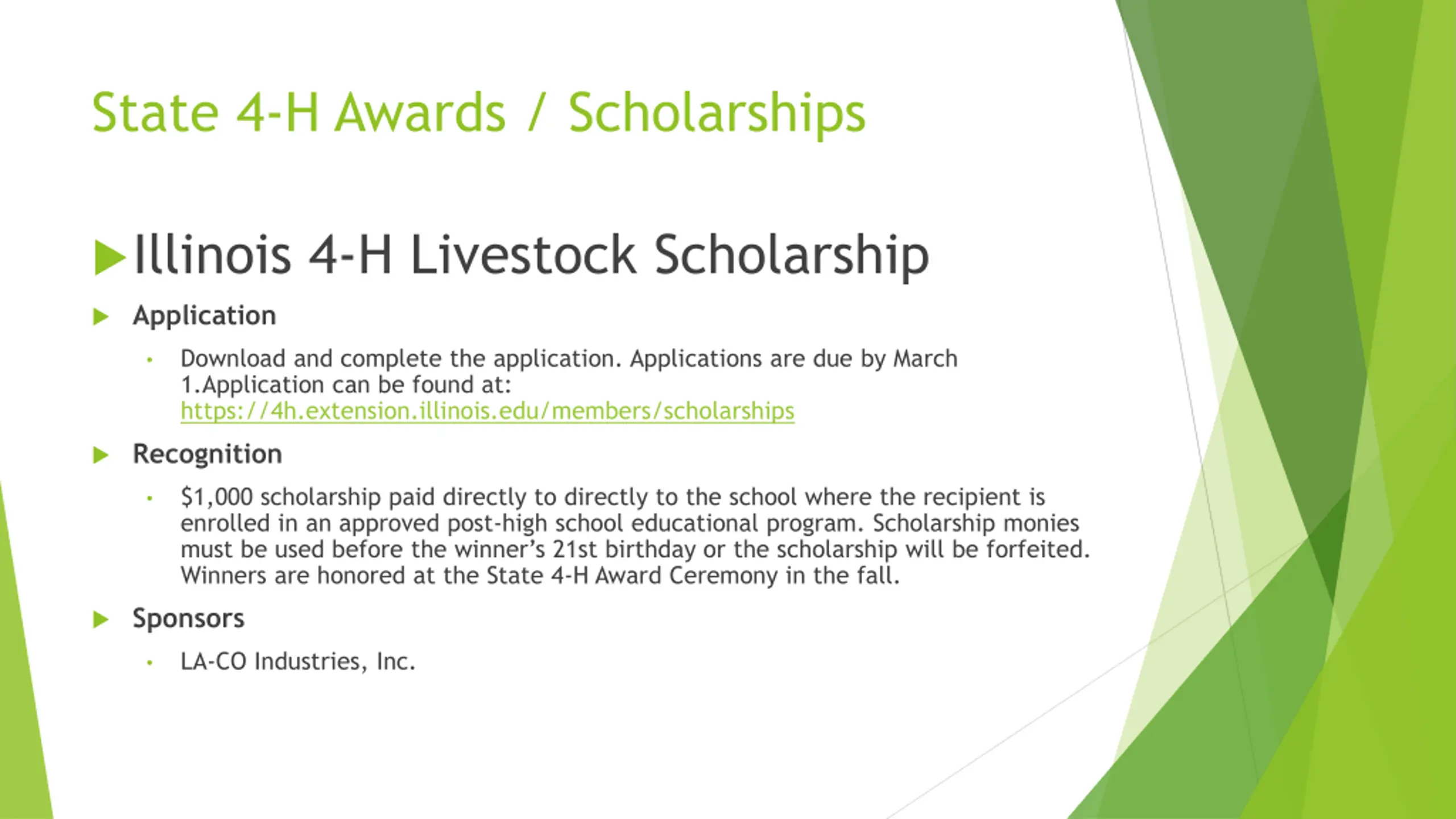 State 4-H Awards / Scholarships Illinois 4-H Livestock Scholarship Application Download and complete the application. Applications are due by March 1.Application can be found at: https://4h.extension.illinois.edu/members/scholarships Recognition $1,000 scholarship paid directly to directly to the school where the recipient is enrolled in an approved post-high school educational program. Scholarship monies must be used before the winner s 21st birthday or the scholarship will be forfeited. Winners are honored at the State 4-H Award Ceremony in the fall. Sponsors LA-CO Industries, Inc.