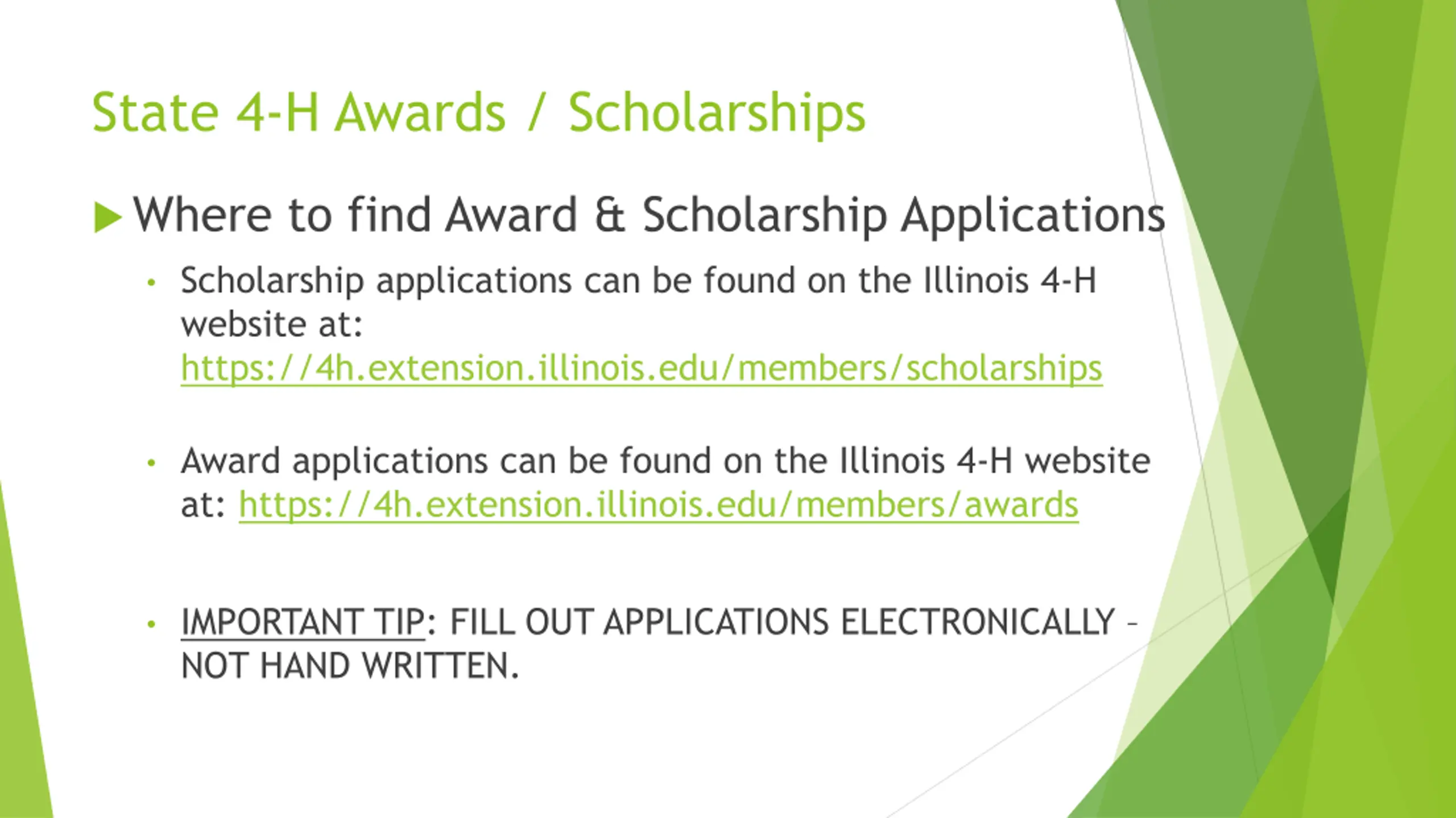 State 4-H Awards / Scholarships Where to find Award & Scholarship Applications Scholarship applications can be found on the Illinois 4-H website at: https://4h.extension.illinois.edu/members/scholarships Award applications can be found on the Illinois 4-H website at: https://4h.extension.illinois.edu/members/awards IMPORTANT TIP: FILL OUT APPLICATIONS ELECTRONICALLY NOT HAND WRITTEN.