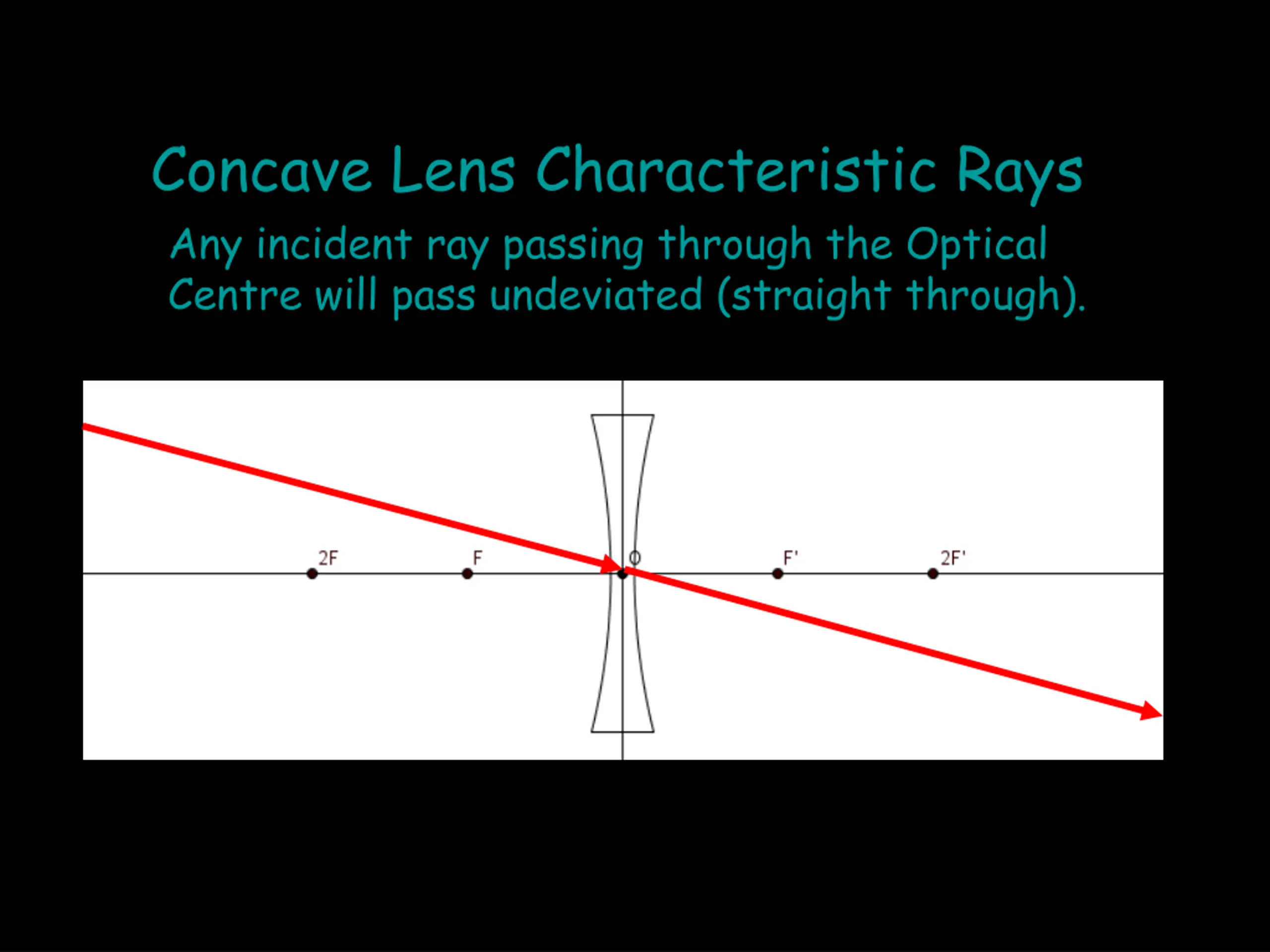 Concave Lens Characteristic Rays Any incident ray passing through the Optical Centre will pass undeviated (straight through).