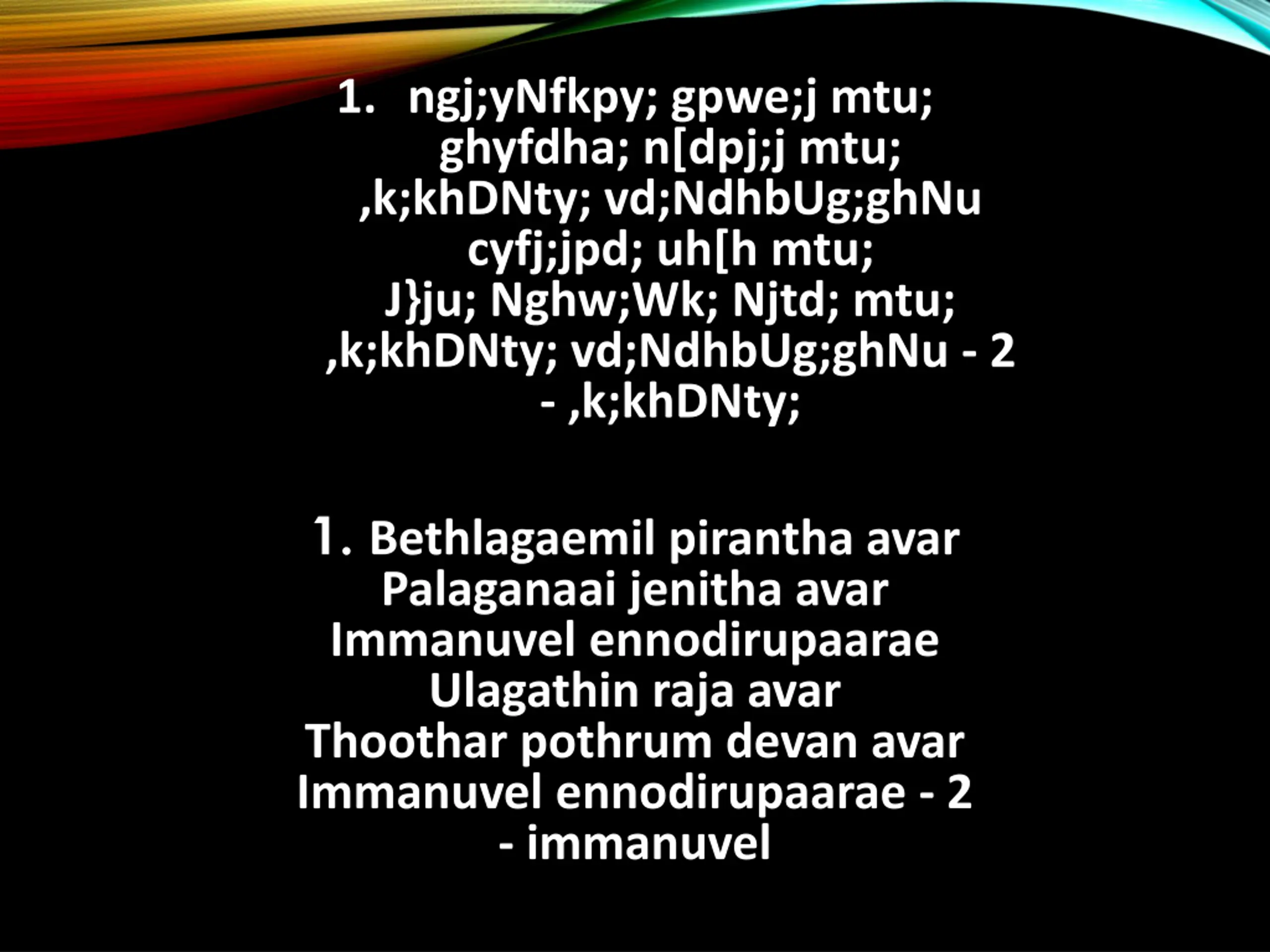 1. ngj;yNfkpy; gpwe;j mtu; ghyfdha; n[dpj;j mtu; ,k;khDNty; vd;NdhbUg;ghNu cyfj;jpd; uh[h mtu; J}ju; Nghw;Wk; Njtd; mtu; ,k;khDNty; vd;NdhbUg;ghNu - 2 - ,k;khDNty; 1. Bethlagaemil pirantha avar Palaganaai jenitha avar Immanuvel ennodirupaarae Ulagathin raja avar Thoothar pothrum devan avar Immanuvel ennodirupaarae - 2 - immanuvel