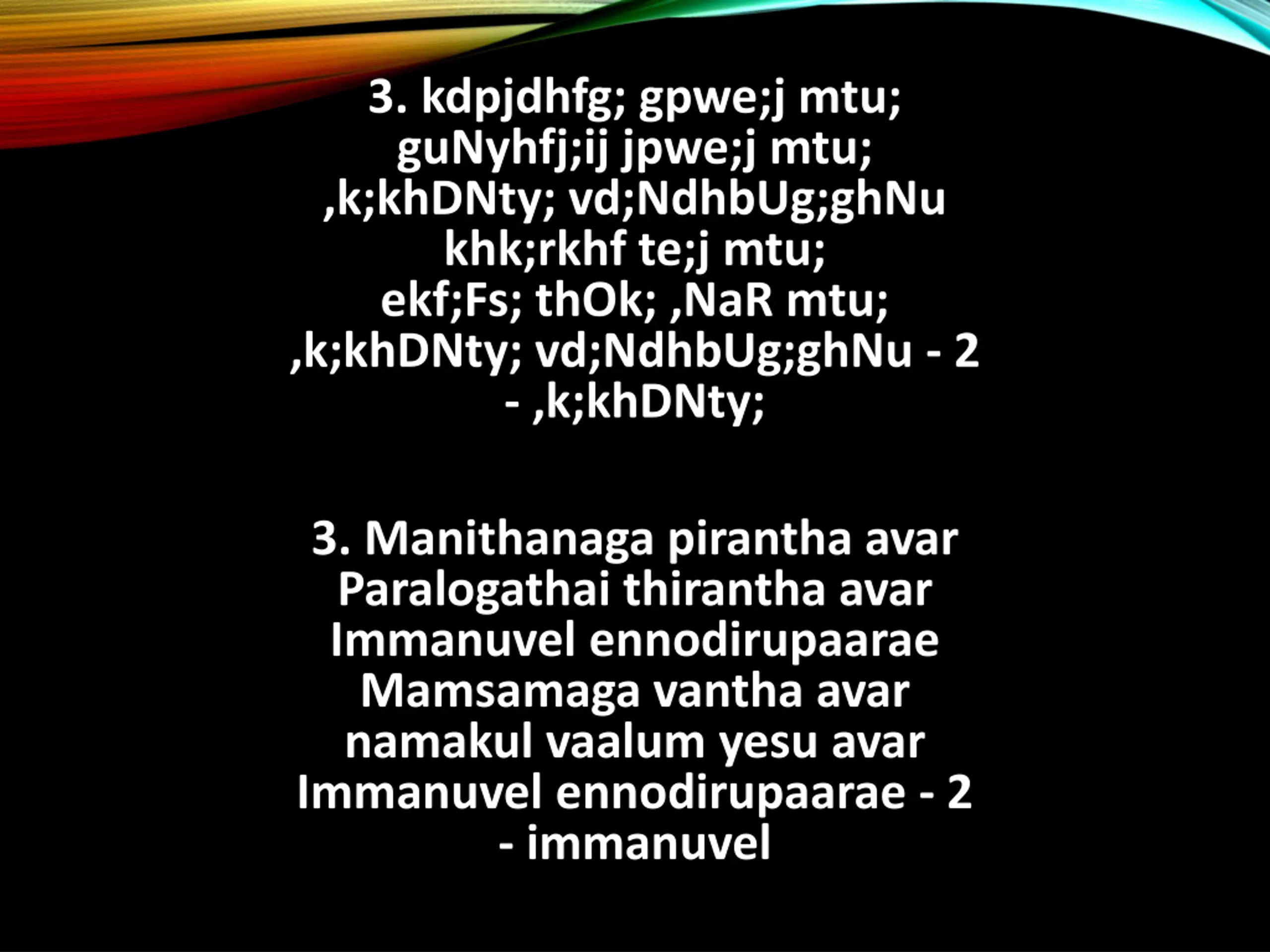 3. kdpjdhfg; gpwe;j mtu; guNyhfj;ij jpwe;j mtu; ,k;khDNty; vd;NdhbUg;ghNu khk;rkhf te;j mtu; ekf;Fs; thOk; ,NaR mtu; ,k;khDNty; vd;NdhbUg;ghNu - 2 - ,k;khDNty; 3. Manithanaga pirantha avar Paralogathai thirantha avar Immanuvel ennodirupaarae Mamsamaga vantha avar namakul vaalum yesu avar Immanuvel ennodirupaarae - 2 - immanuvel
