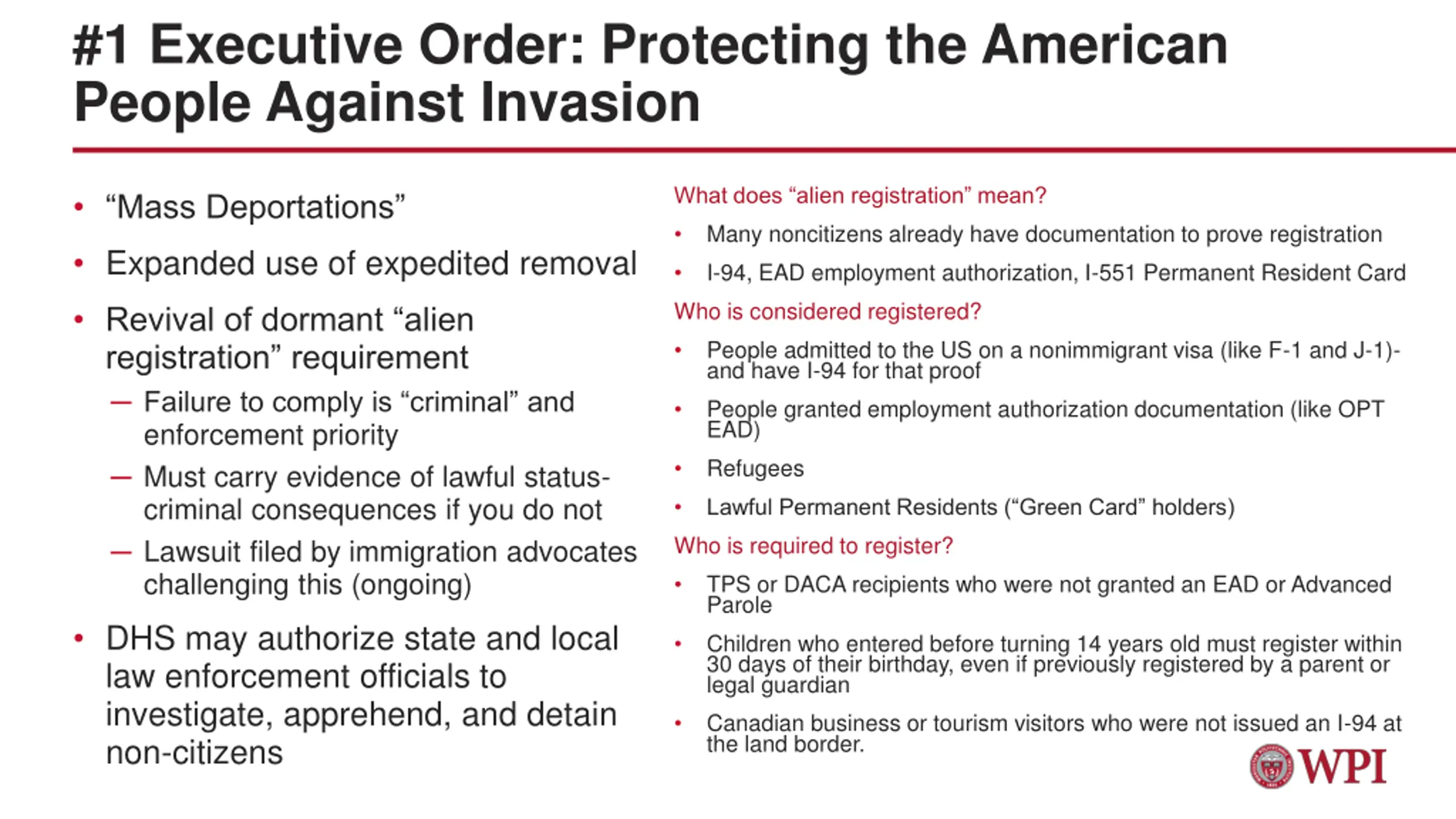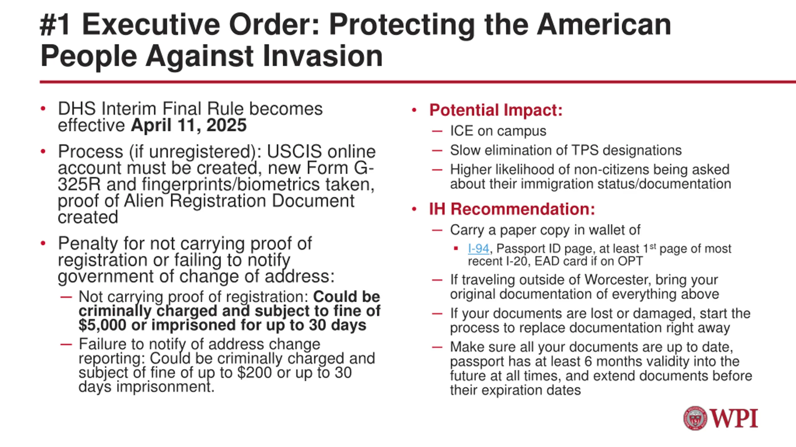 #1 Executive Order: Protecting the American People Against Invasion DHS Interim Final Rule becomes effective April 11, 2025 Process (if unregistered): USCIS online account must be created, new Form G- 325R and fingerprints/biometrics taken, proof of Alien Registration Document created Penalty for not carrying proof of registration or failing to notify government of change of address: Not carrying proof of registration: Could be criminally charged and subject to fine of $5,000 or imprisoned for up to 30 days Failure to notify of address change reporting: Could be criminally charged and subject of fine of up to $200 or up to 30 days imprisonment. Potential Impact: ICE on campus Slow elimination of TPS designations Higher likelihood of non-citizens being asked about their immigration status/documentation IH Recommendation: Carry a paper copy in wallet of I-94, Passport ID page, at least 1st page of most recent I-20, EAD card if on OPT If traveling outside of Worcester, bring your original documentation of everything above If your documents are lost or damaged, start the process to replace documentation right away Make sure all your documents are up to date, passport has at least 6 months validity into the future at all times, and extend documents before their expiration dates