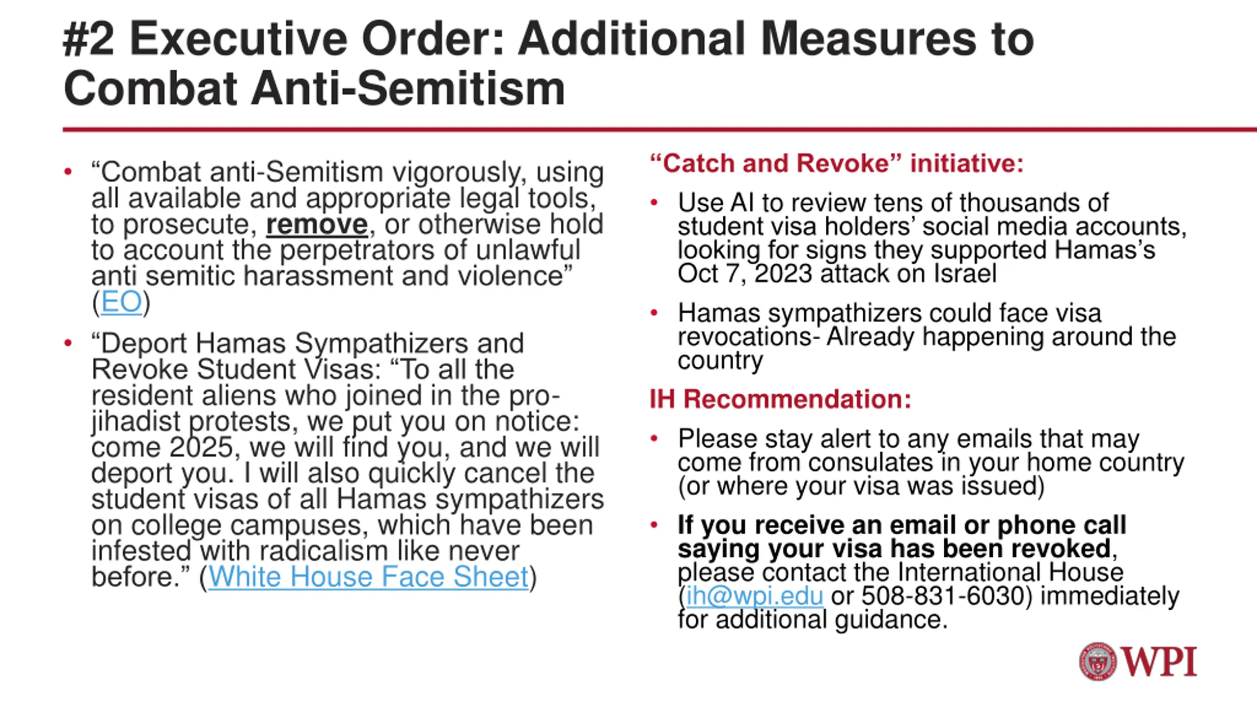 #2 Executive Order: Additional Measures to Combat Anti-Semitism Catch and Revoke initiative: Use AI to review tens of thousands of student visa holders social media accounts, looking for signs they supported Hamas s Oct 7, 2023 attack on Israel Hamas sympathizers could face visa revocations- Already happening around the country IH Recommendation: Please stay alert to any emails that may come from consulates in your home country (or where your visa was issued) If you receive an email or phone call saying your visa has been revoked, please contact the International House (ih@wpi.edu or 508-831-6030) immediately for additional guidance. Combat anti-Semitism vigorously, using all available and appropriate legal tools, to prosecute, remove, or otherwise hold to account the perpetrators of unlawful anti semitic harassment and violence (EO) Deport Hamas Sympathizers and Revoke Student Visas: To all the resident aliens who joined in the pro- jihadist protests, we put you on notice: come 2025, we will find you, and we will deport you. I will also quickly cancel the student visas of all Hamas sympathizers on college campuses, which have been infested with radicalism like never before. (White House Face Sheet)
