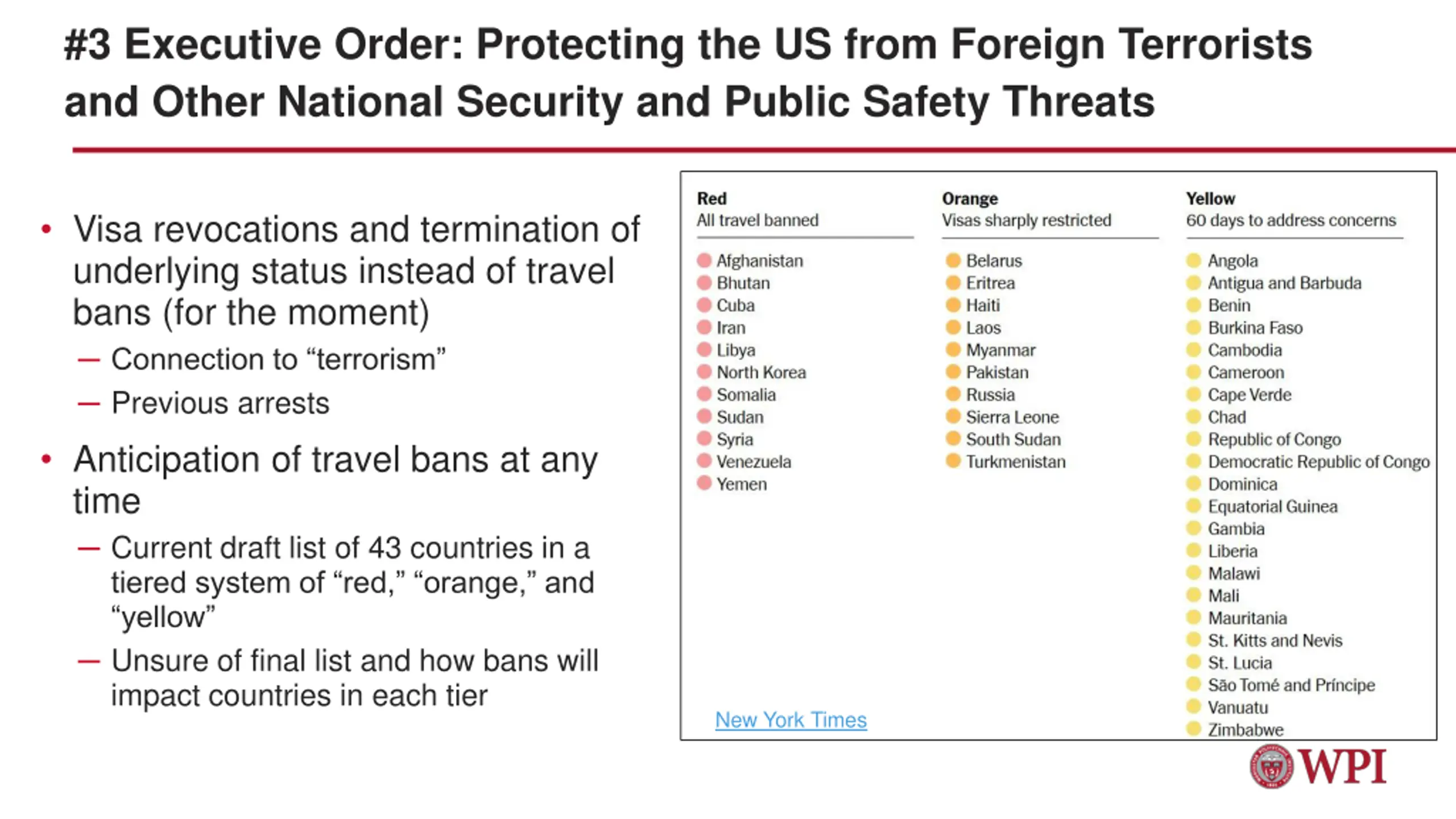 #3 Executive Order: Protecting the US from Foreign Terrorists and Other National Security and Public Safety Threats Visa revocations and termination of underlying status instead of travel bans (for the moment) Connection to terrorism Previous arrests Anticipation of travel bans at any time Current draft list of 43 countries in a tiered system of red, orange, and yellow Unsure of final list and how bans will impact countries in each tier New York Times