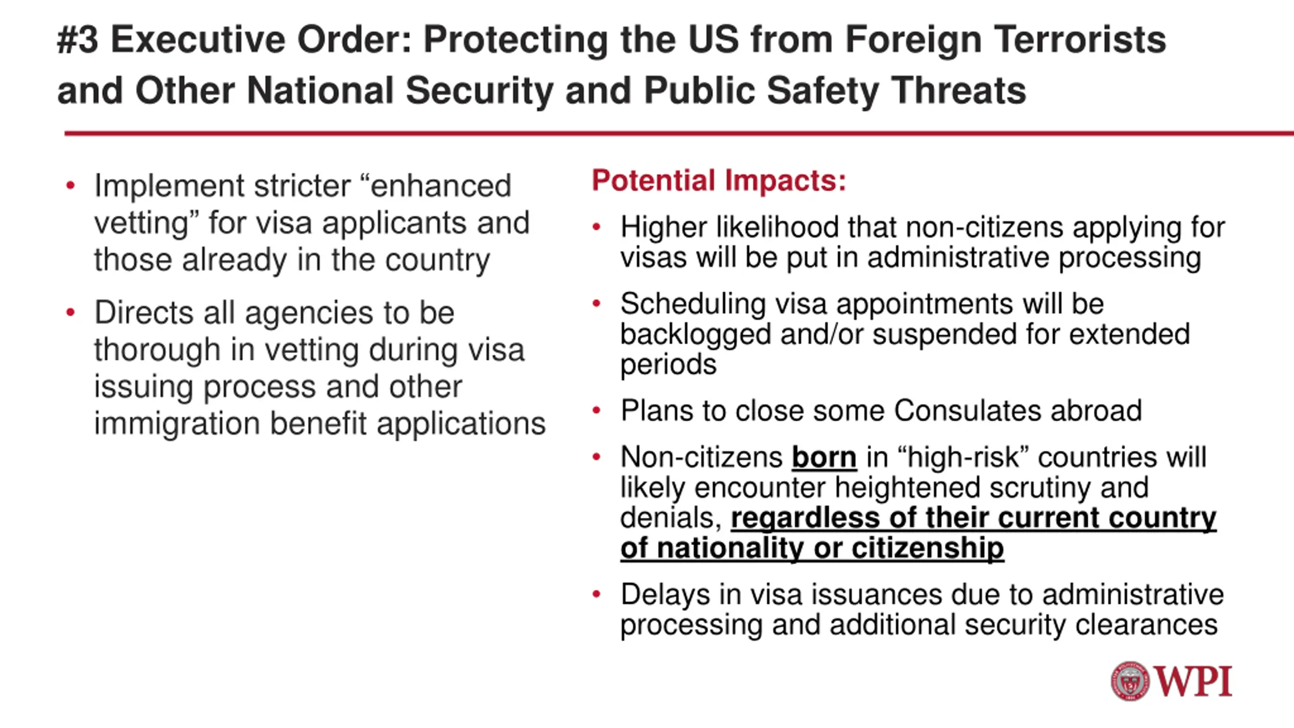 #3 Executive Order: Protecting the US from Foreign Terrorists and Other National Security and Public Safety Threats Potential Impacts: Higher likelihood that non-citizens applying for visas will be put in administrative processing Scheduling visa appointments will be backlogged and/or suspended for extended periods Plans to close some Consulates abroad Non-citizens bornin high-risk countries will likely encounter heightened scrutiny and denials, regardless of their current country of nationality or citizenship Delays in visa issuances due to administrative processing and additional security clearances Implement stricter enhanced vetting for visa applicants and those already in the country Directs all agencies to be thorough in vetting during visa issuing process and other immigration benefit applications