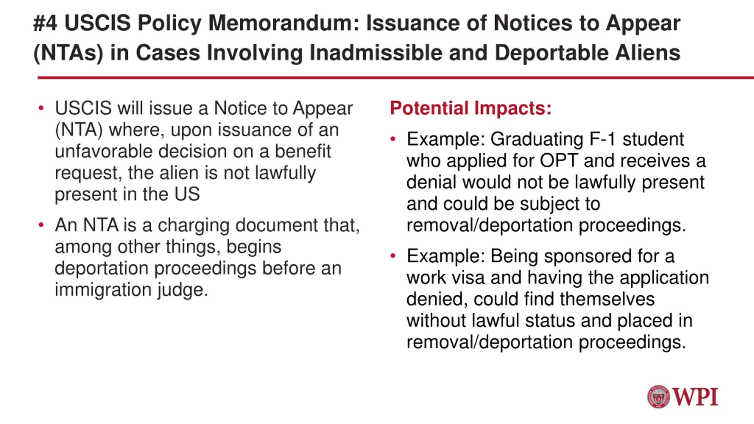 #4 USCIS Policy Memorandum: Issuance of Notices to Appear (NTAs) in Cases Involving Inadmissible and Deportable Aliens USCIS will issue a Notice to Appear (NTA) where, upon issuance of an unfavorable decision on a benefit request, the alien is not lawfully present in the US An NTA is a charging document that, among other things, begins deportation proceedings before an immigration judge. Potential Impacts: Example: Graduating F-1 student who applied for OPT and receives a denial would not be lawfully present and could be subject to removal/deportation proceedings. Example: Being sponsored for a work visa and having the application denied, could find themselves without lawful status and placed in removal/deportation proceedings.