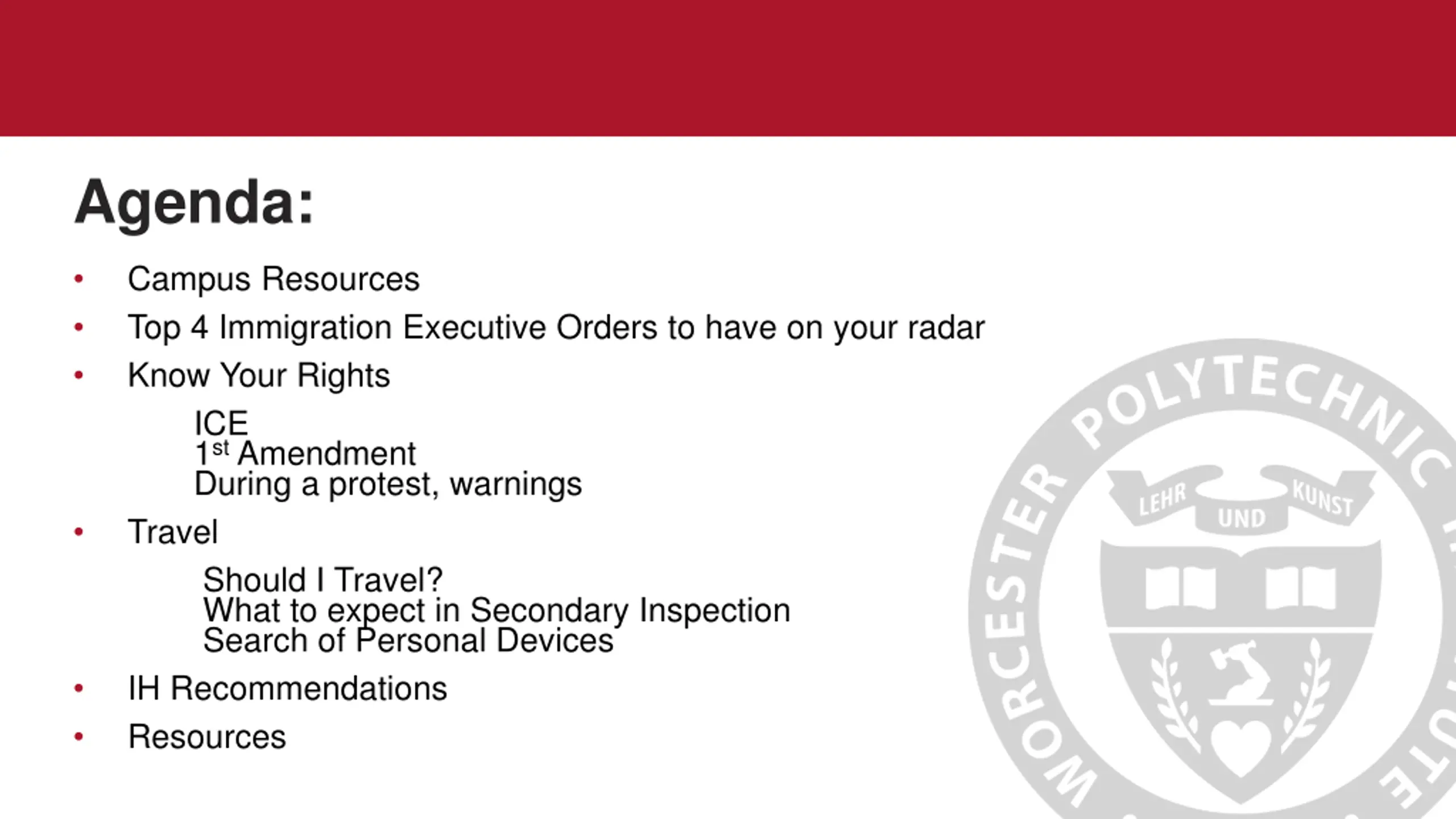 Agenda: Campus Resources Top 4 Immigration Executive Orders to have on your radar Know Your Rights ICE 1st Amendment During a protest, warnings Travel Should I Travel? What to expect in Secondary Inspection Search of Personal Devices IH Recommendations Resources