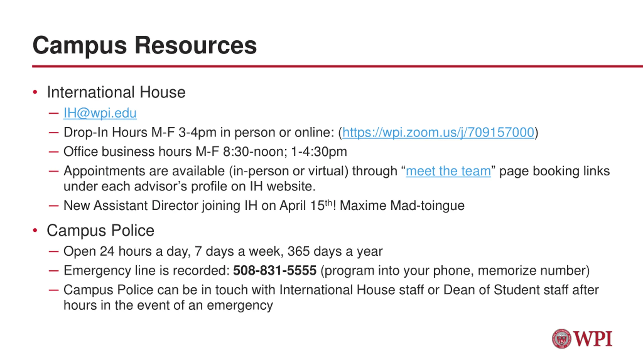 Campus Resources International House IH@wpi.edu Drop-In Hours M-F 3-4pm in person or online: (https://wpi.zoom.us/j/709157000) Office business hours M-F 8:30-noon; 1-4:30pm Appointments are available (in-person or virtual) through meet the team page booking links under each advisor s profile on IH website. New Assistant Director joining IH on April 15th! Maxime Mad-toingue Campus Police Open 24 hours a day, 7 days a week, 365 days a year Emergency line is recorded: 508-831-5555 (program into your phone, memorize number) Campus Police can be in touch with International House staff or Dean of Student staff after hours in the event of an emergency