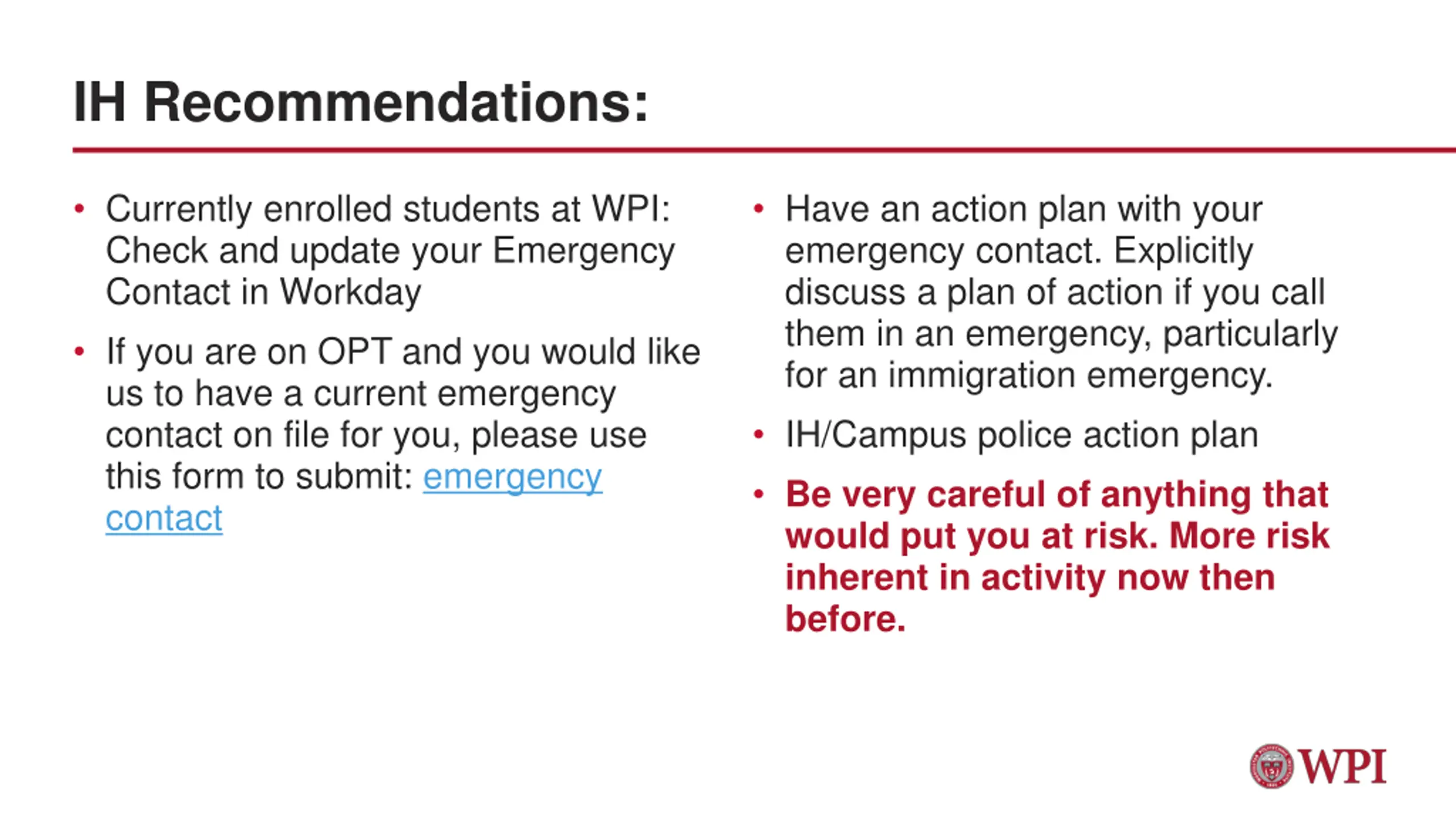 IH Recommendations: Currently enrolled students at WPI: Check and update your Emergency Contact in Workday If you are on OPT and you would like us to have a current emergency contact on file for you, please use this form to submit: emergency contact Have an action plan with your emergency contact. Explicitly discuss a plan of action if you call them in an emergency, particularly for an immigration emergency. IH/Campus police action plan Be very careful of anything that would put you at risk. More risk inherent in activity now then before.