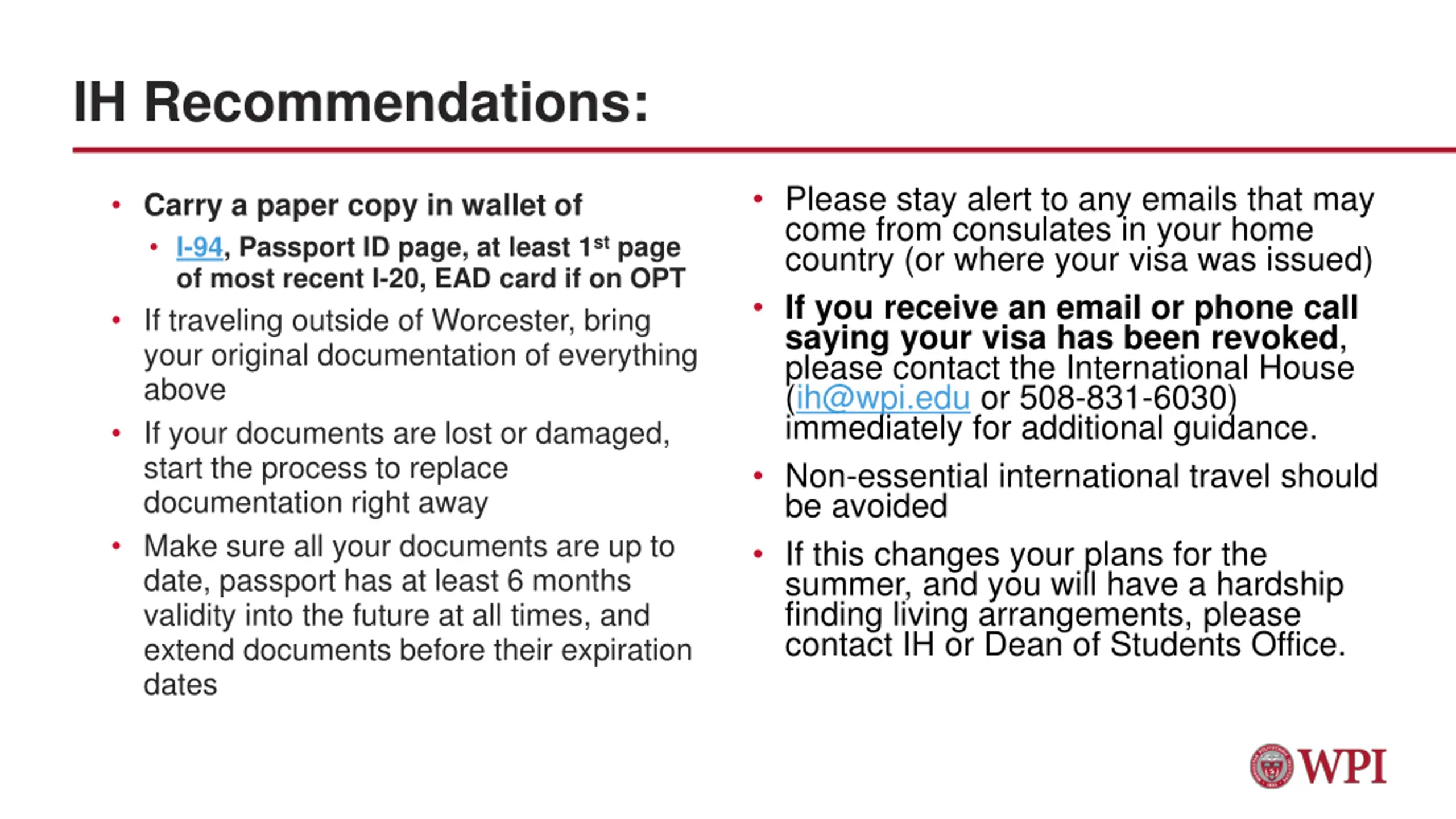IH Recommendations: Please stay alert to any emails that may come from consulates in your home country (or where your visa was issued) If you receive an email or phone call saying your visa has been revoked, please contact the International House (ih@wpi.edu or 508-831-6030) immediately for additional guidance. Non-essential international travel should be avoided If this changes your plans for the summer, and you will have a hardship finding living arrangements, please contact IH or Dean of Students Office. Carry a paper copy in wallet of I-94, Passport ID page, at least 1st page of most recent I-20, EAD card if on OPT If traveling outside of Worcester, bring your original documentation of everything above If your documents are lost or damaged, start the process to replace documentation right away Make sure all your documents are up to date, passport has at least 6 months validity into the future at all times, and extend documents before their expiration dates