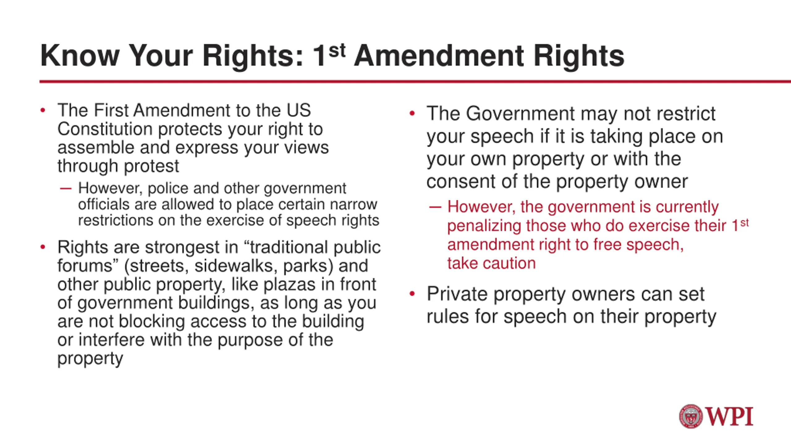 Know Your Rights: 1st Amendment Rights The First Amendment to the US Constitution protects your right to assemble and express your views through protest However, police and other government officials are allowed to place certain narrow restrictions on the exercise of speech rights Rights are strongest in traditional public forums (streets, sidewalks, parks) and other public property, like plazas in front of government buildings, as long as you are not blocking access to the building or interfere with the purpose of the property The Government may not restrict your speech if it is taking place on your own property or with the consent of the property owner However, the government is currently penalizing those who do exercise their 1st amendment right to free speech, take caution Private property owners can set rules for speech on their property