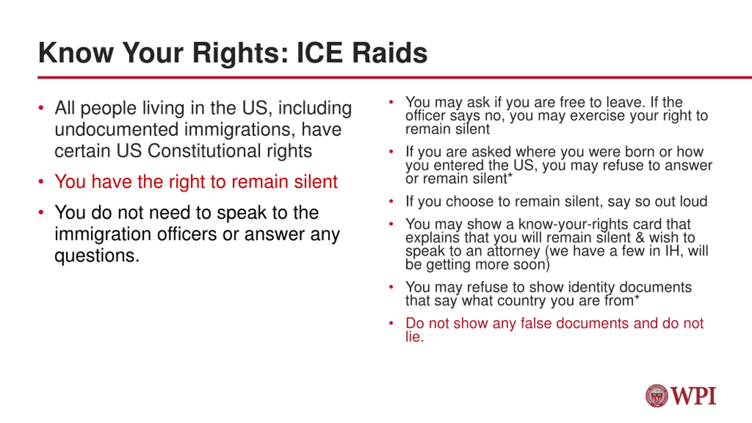 Know Your Rights: ICE Raids You may ask if you are free to leave. If the officer says no, you may exercise your right to remain silent If you are asked where you were born or how you entered the US, you may refuse to answer or remain silent* If you choose to remain silent, say so out loud You may show a know-your-rights card that explains that you will remain silent & wish to speak to an attorney (we have a few in IH, will be getting more soon) You may refuse to show identity documents that say what country you are from* Do not show any false documents and do not lie. All people living in the US, including undocumented immigrations, have certain US Constitutional rights You have the right to remain silent You do not need to speak to the immigration officers or answer any questions.