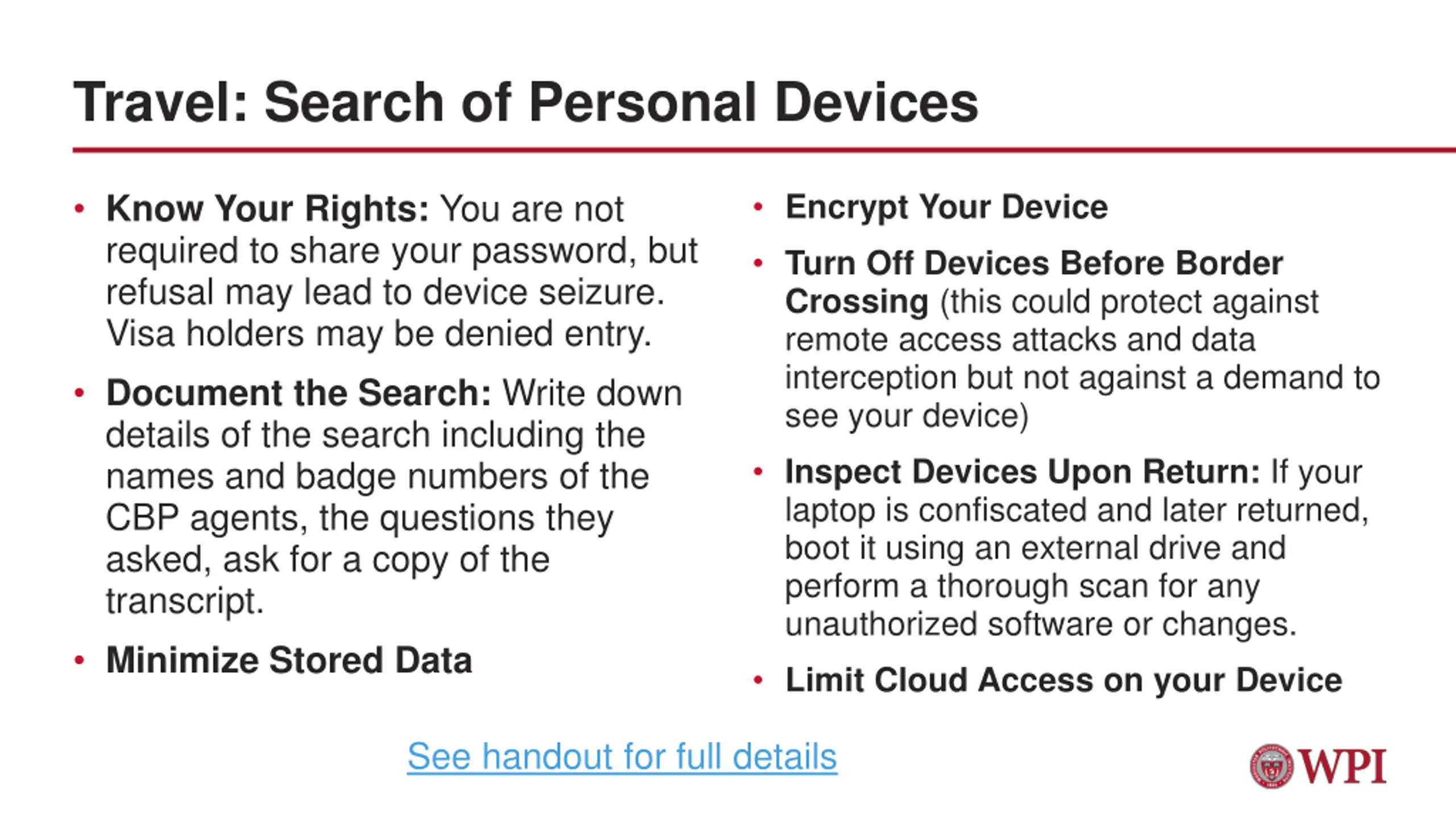 Travel: Search of Personal Devices Know Your Rights: You are not required to share your password, but refusal may lead to device seizure. Visa holders may be denied entry. Document the Search: Write down details of the search including the names and badge numbers of the CBP agents, the questions they asked, ask for a copy of the transcript. Minimize Stored Data Encrypt Your Device Turn Off Devices Before Border Crossing (this could protect against remote access attacks and data interception but not against a demand to see your device) Inspect Devices Upon Return: If your laptop is confiscated and later returned, boot it using an external drive and perform a thorough scan for any unauthorized software or changes. Limit Cloud Access on your Device See handout for full details