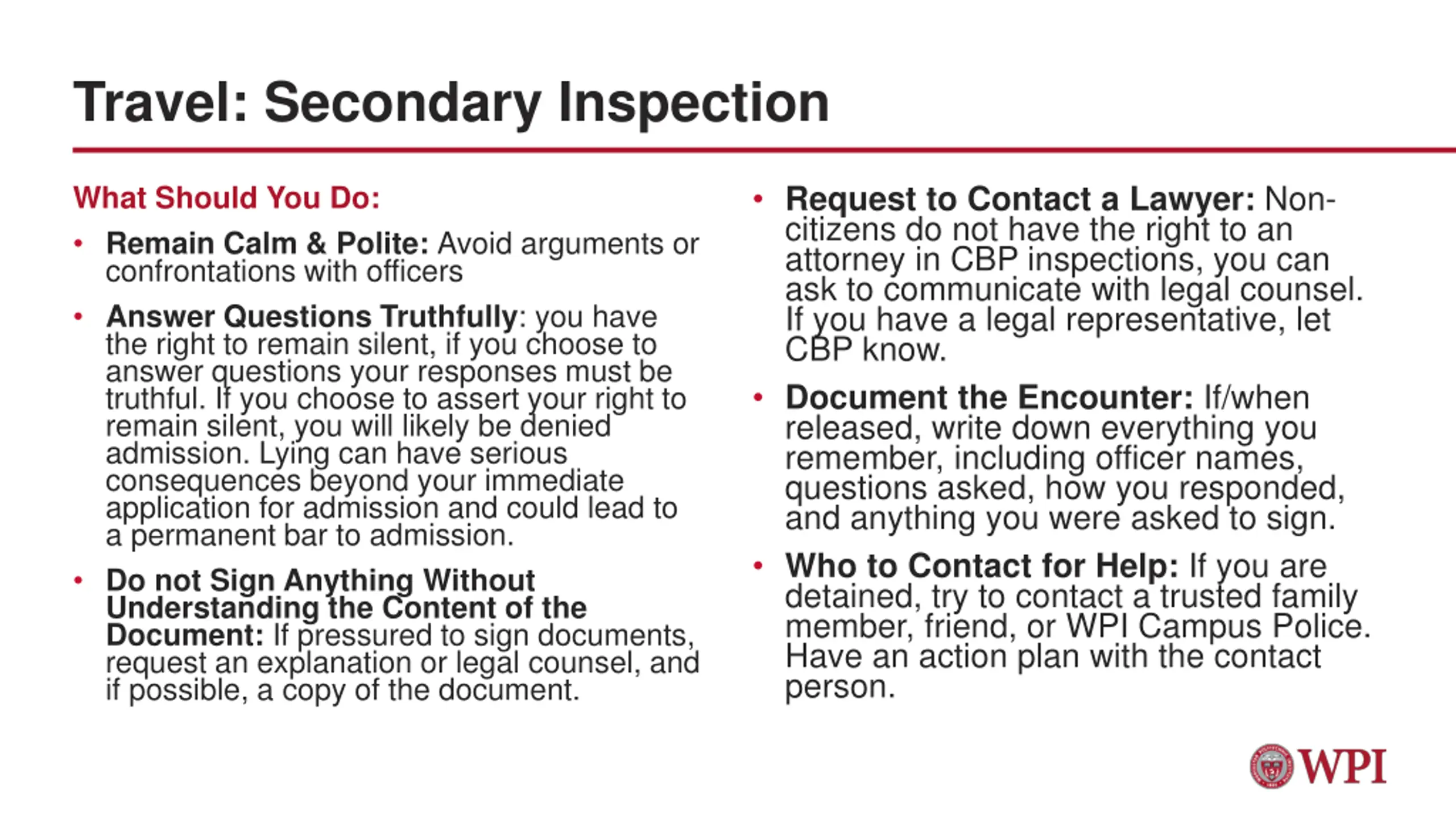 Travel: Secondary Inspection Request to Contact a Lawyer: Non- citizens do not have the right to an attorney in CBP inspections, you can ask to communicate with legal counsel. If you have a legal representative, let CBP know. Document the Encounter: If/when released, write down everything you remember, including officer names, questions asked, how you responded, and anything you were asked to sign. Who to Contact for Help: If you are detained, try to contact a trusted family member, friend, or WPI Campus Police. Have an action plan with the contact person. What Should You Do: Remain Calm & Polite: Avoid arguments or confrontations with officers Answer Questions Truthfully: you have the right to remain silent, if you choose to answer questions your responses must be truthful. If you choose to assert your right to remain silent, you will likely be denied admission. Lying can have serious consequences beyond your immediate application for admission and could lead to a permanent bar to admission. Do not Sign Anything Without Understanding the Content of the Document: If pressured to sign documents, request an explanation or legal counsel, and if possible, a copy of the document.