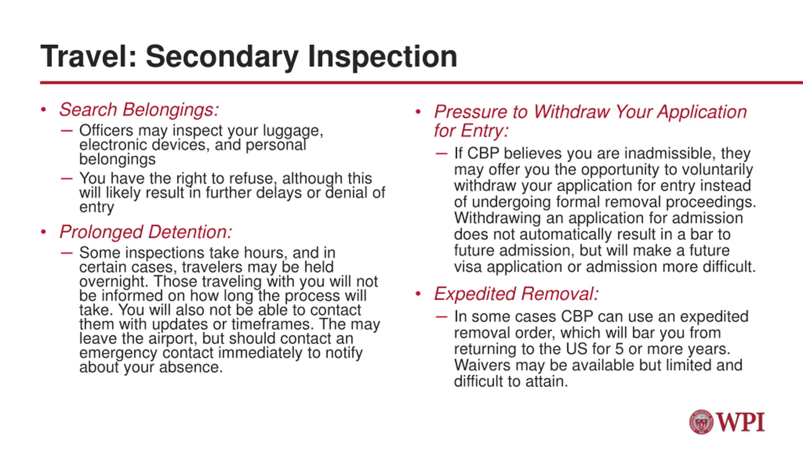 Travel: Secondary Inspection Search Belongings: Officers may inspect your luggage, electronic devices, and personal belongings You have the right to refuse, although this will likely result in further delays or denial of entry Prolonged Detention: Some inspections take hours, and in certain cases, travelers may be held overnight. Those traveling with you will not be informed on how long the process will take. You will also not be able to contact them with updates or timeframes. The may leave the airport, but should contact an emergency contact immediately to notify about your absence. Pressure to Withdraw Your Application for Entry: If CBP believes you are inadmissible, they may offer you the opportunity to voluntarily withdraw your application for entry instead of undergoing formal removal proceedings. Withdrawing an application for admission does not automatically result in a bar to future admission, but will make a future visa application or admission more difficult. Expedited Removal: In some cases CBP can use an expedited removal order, which will bar you from returning to the US for 5 or more years. Waivers may be available but limited and difficult to attain.