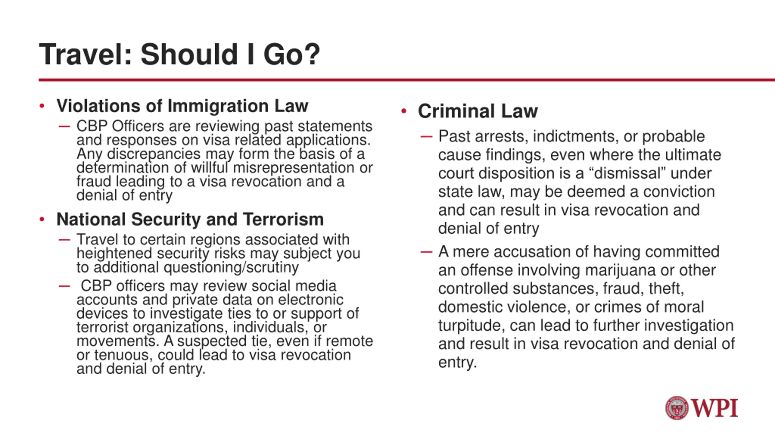 Travel: Should I Go? Violations of Immigration Law CBP Officers are reviewing past statements and responses on visa related applications. Any discrepancies may form the basis of a determination of willful misrepresentation or fraud leading to a visa revocation and a denial of entry National Security and Terrorism Travel to certain regions associated with heightened security risks may subject you to additional questioning/scrutiny CBP officers may review social media accounts and private data on electronic devices to investigate ties to or support of terrorist organizations, individuals, or movements. A suspected tie, even if remote or tenuous, could lead to visa revocation and denial of entry. Criminal Law Past arrests, indictments, or probable cause findings, even where the ultimate court disposition is a dismissal under state law, may be deemed a conviction and can result in visa revocation and denial of entry A mere accusation of having committed an offense involving marijuana or other controlled substances, fraud, theft, domestic violence, or crimes of moral turpitude, can lead to further investigation and result in visa revocation and denial of entry.