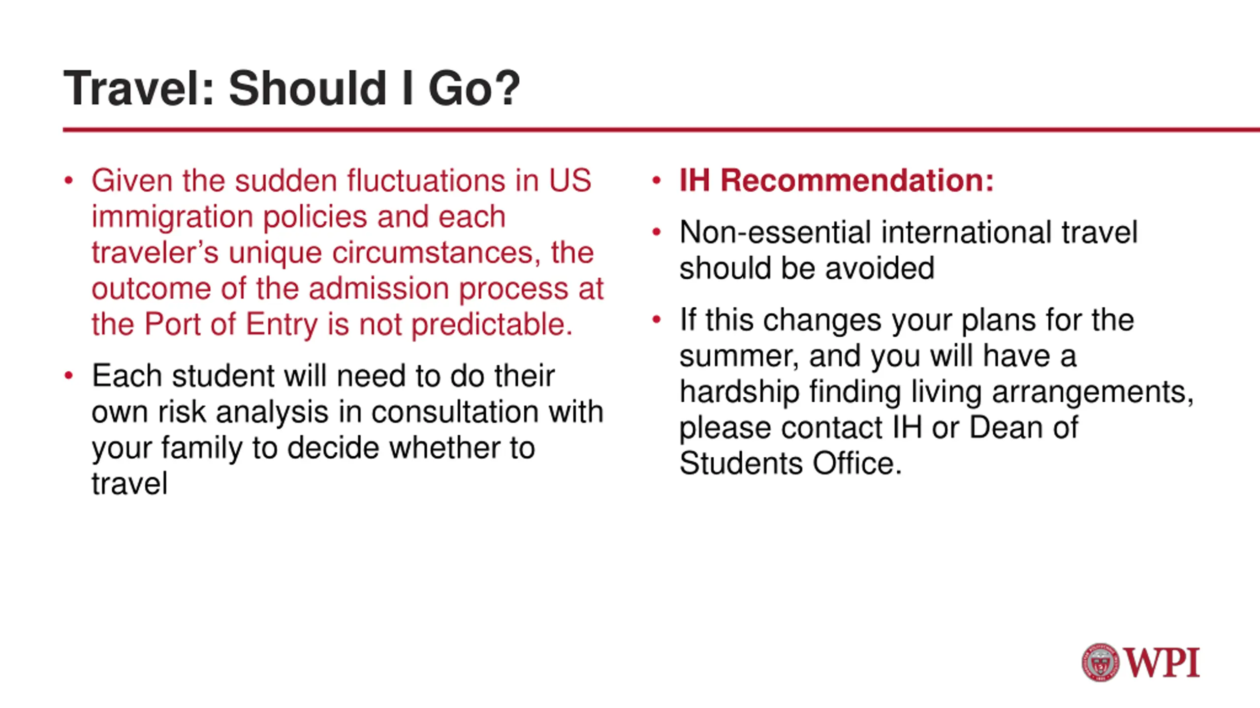 Travel: Should I Go? Given the sudden fluctuations in US immigration policies and each traveler s unique circumstances, the outcome of the admission process at the Port of Entry is not predictable. Each student will need to do their own risk analysis in consultation with your family to decide whether to travel IH Recommendation: Non-essential international travel should be avoided If this changes your plans for the summer, and you will have a hardship finding living arrangements, please contact IH or Dean of Students Office.