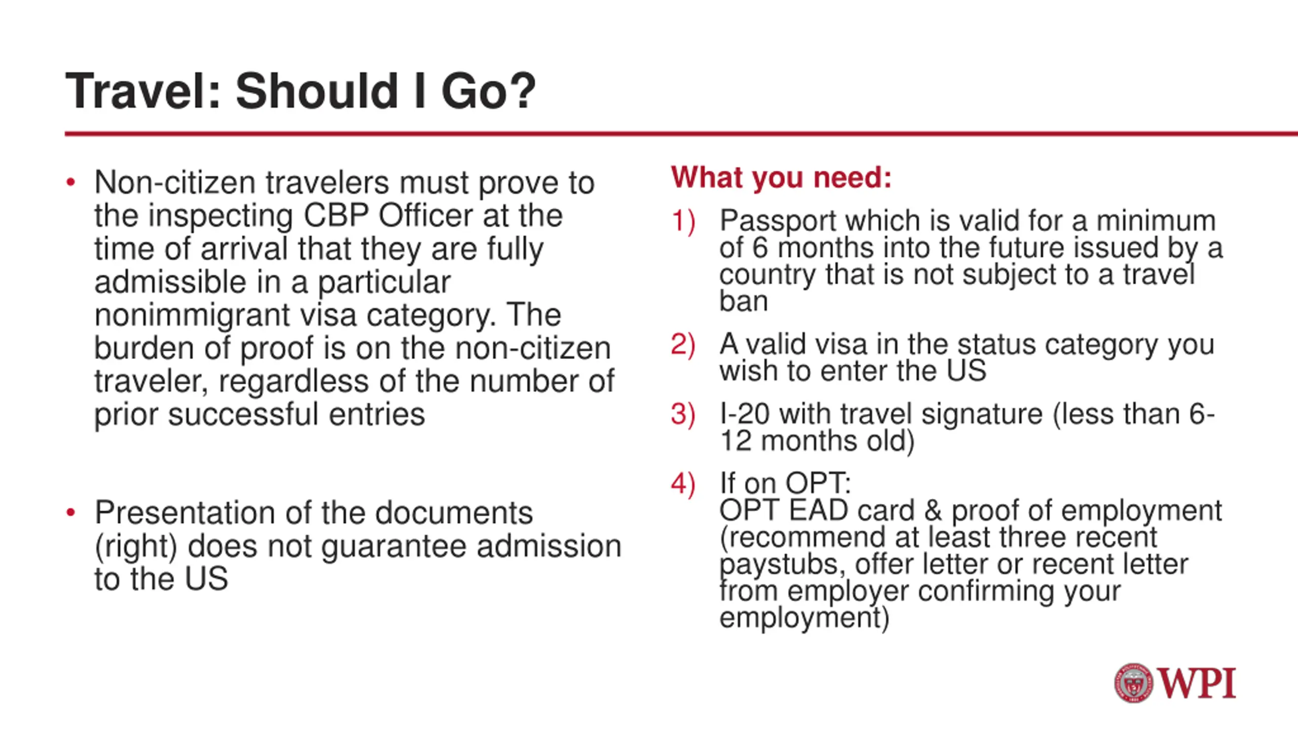 Travel: Should I Go? What you need: 1) Passport which is valid for a minimum of 6 months into the future issued by a country that is not subject to a travel ban 2) A valid visa in the status category you wish to enter the US 3) I-20 with travel signature (less than 6- 12 months old) 4) If on OPT: OPT EAD card & proof of employment (recommend at least three recent paystubs, offer letter or recent letter from employer confirming your employment) Non-citizen travelers must prove to the inspecting CBP Officer at the time of arrival that they are fully admissible in a particular nonimmigrant visa category. The burden of proof is on the non-citizen traveler, regardless of the number of prior successful entries Presentation of the documents (right) does not guarantee admission to the US