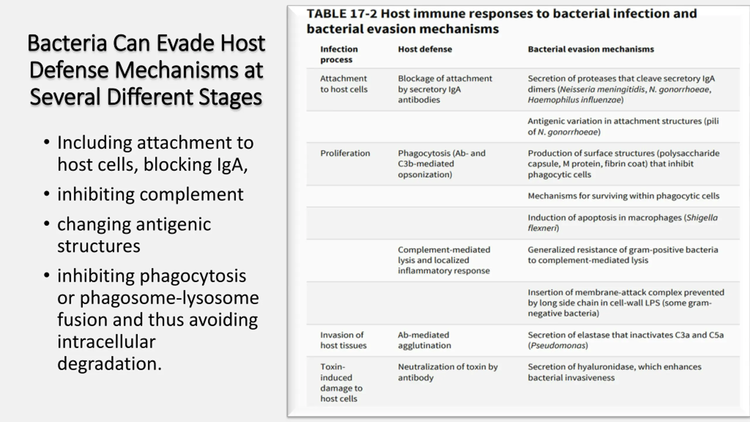 Bacteria Can Evade Host Bacteria Can Evade Host Defense Mechanisms at Defense Mechanisms at Several Different Stages Several Different Stages Including attachment to host cells, blocking IgA, inhibiting complement changing antigenic structures inhibiting phagocytosis or phagosome-lysosome fusion and thus avoiding intracellular degradation.