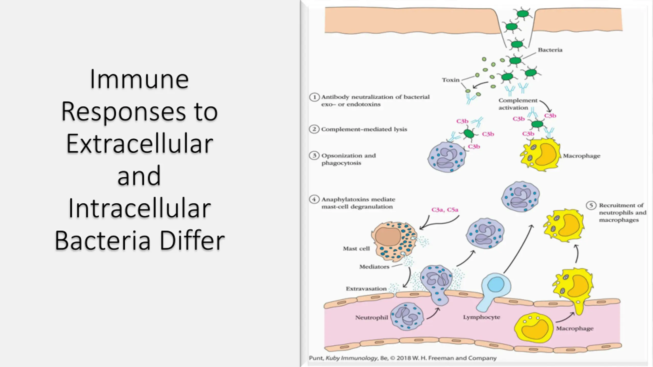Immune Responses to Extracellular and Intracellular Immune Responses to Extracellular and Intracellular Bacteria Differ Bacteria Differ Immunity to bacterial infections is usually achieved by a combination of humoral and cell-mediated immunity, depending on the type of pathogen. humoral immune response is the main protective response against extracellular bacteria. Antibodies which are secreted by plasma cells in regional lymph nodes or the submucosa of the respiratory and gastrointestinal tracts 1. Antibody neutralizes bacterial toxins. 2. Complement activation on bacterial surfaces leads to complement-mediated lysis of bacteria. 3. Antibody and the complement split product C3b bind to bacteria, serving as opsonins to increase phagocytosis. 4. C3a and C5a, generated by antibody-initiated complement activation, induce local mast- cell degranulation, releasing substances that mediate vasodilation and extravasation of lymphocytes and neutrophils. 5. Other complement products are chemotactic for neutrophils and macrophages.