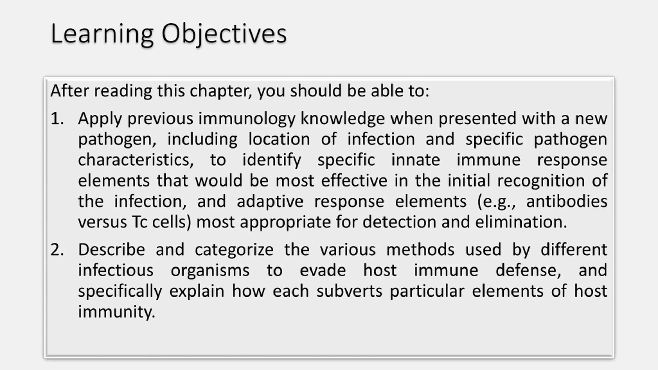 Learning Objectives After reading this chapter, you should be able to: 1. Apply previous immunology knowledge when presented with a new pathogen, including location of infection and specific pathogen characteristics, to identify specific innate immune response elements that would be most effective in the initial recognition of the infection, and adaptive response elements (e.g., antibodies versus Tc cells) most appropriate for detection and elimination. 2. Describe and categorize the various methods used by different infectious organisms to evade host immune defense, and specifically explain how each subverts particular elements of host immunity.