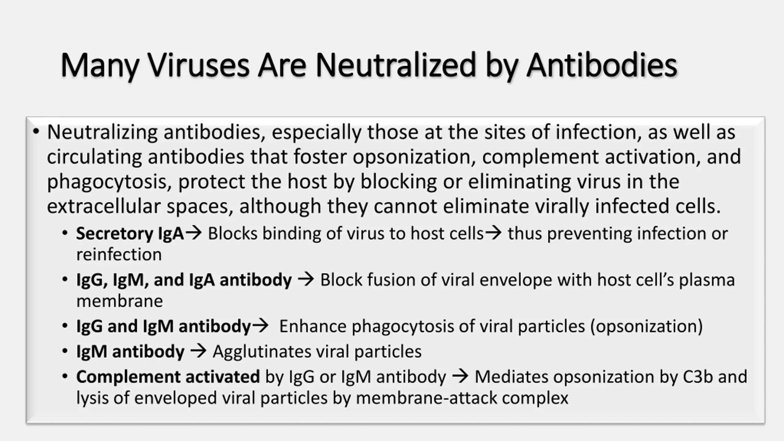 Many Viruses Are Neutralized by Antibodies Many Viruses Are Neutralized by Antibodies Neutralizing antibodies, especially those at the sites of infection, as well as circulating antibodies that foster opsonization, complement activation, and phagocytosis, protect the host by blocking or eliminating virus in the extracellular spaces, although they cannot eliminate virally infected cells. Secretory IgA Blocks binding of virus to host cells thus preventing infection or reinfection IgG, IgM, and IgA antibody Block fusion of viral envelope with host cell s plasma membrane IgG and IgM antibody Enhance phagocytosis of viral particles (opsonization) IgM antibody Agglutinates viral particles Complement activated by IgG or IgM antibody Mediates opsonization by C3b and lysis of enveloped viral particles by membrane-attack complex