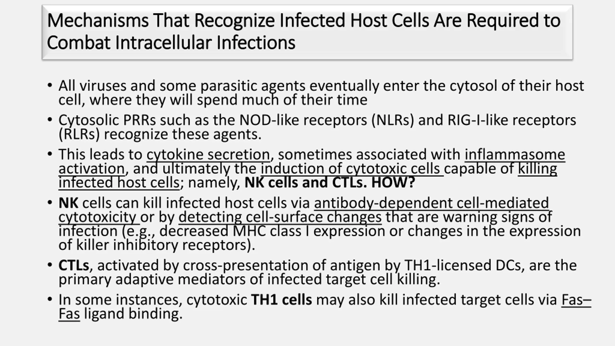 Mechanisms That Recognize Infected Host Cells Are Required to Mechanisms That Recognize Infected Host Cells Are Required to Combat Intracellular Infections Combat Intracellular Infections All viruses and some parasitic agents eventually enter the cytosol of their host cell, where they will spend much of their time Cytosolic PRRs such as the NOD-like receptors (NLRs) and RIG-I-like receptors (RLRs) recognize these agents. This leads to cytokine secretion, sometimes associated with inflammasome activation, and ultimately the induction of cytotoxic cells capable of killing infected host cells; namely, NK cells and CTLs. HOW? NK cells can kill infected host cells via antibody-dependent cell-mediated cytotoxicity or by detecting cell-surface changes that are warning signs of infection (e.g., decreased MHC class I expression or changes in the expression of killer inhibitory receptors). CTLs, activated by cross-presentation of antigen by TH1-licensed DCs, are the primary adaptive mediators of infected target cell killing. In some instances, cytotoxic TH1 cells may also kill infected target cells via Fas Fas ligand binding.