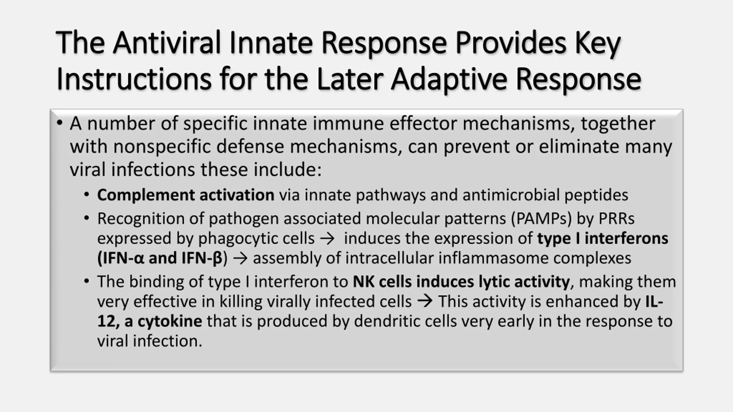 The Antiviral Innate Response Provides Key The Antiviral Innate Response Provides Key Instructions for the Later Adaptive Response Instructions for the Later Adaptive Response A number of specific innate immune effector mechanisms, together with nonspecific defense mechanisms, can prevent or eliminate many viral infections these include: Complement activation via innate pathways and antimicrobial peptides Recognition of pathogen associated molecular patterns (PAMPs) by PRRs expressed by phagocytic cells induces the expression of type I interferons (IFN- and IFN- ) assembly of intracellular inflammasome complexes The binding of type I interferon to NK cells induces lytic activity, making them very effective in killing virally infected cells This activity is enhanced by IL- 12, a cytokine that is produced by dendritic cells very early in the response to viral infection.