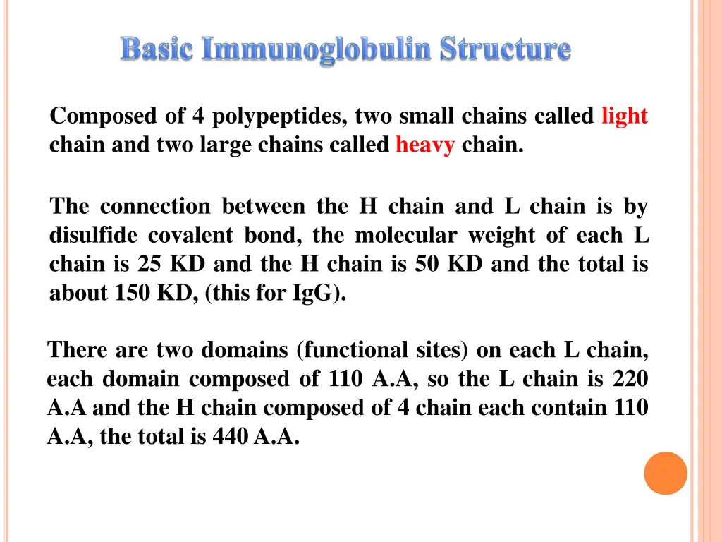 Composed of 4 polypeptides, two small chains called light chain and two large chains called heavy chain. The connection between the H chain and L chain is by disulfide covalent bond, the molecular weight of each L chain is 25 KD and the H chain is 50 KD and the total is about 150 KD, (this for IgG). There are two domains (functional sites) on each L chain, each domain composed of 110 A.A, so the L chain is 220 A.A and the H chain composed of 4 chain each contain 110 A.A, the total is 440 A.A.