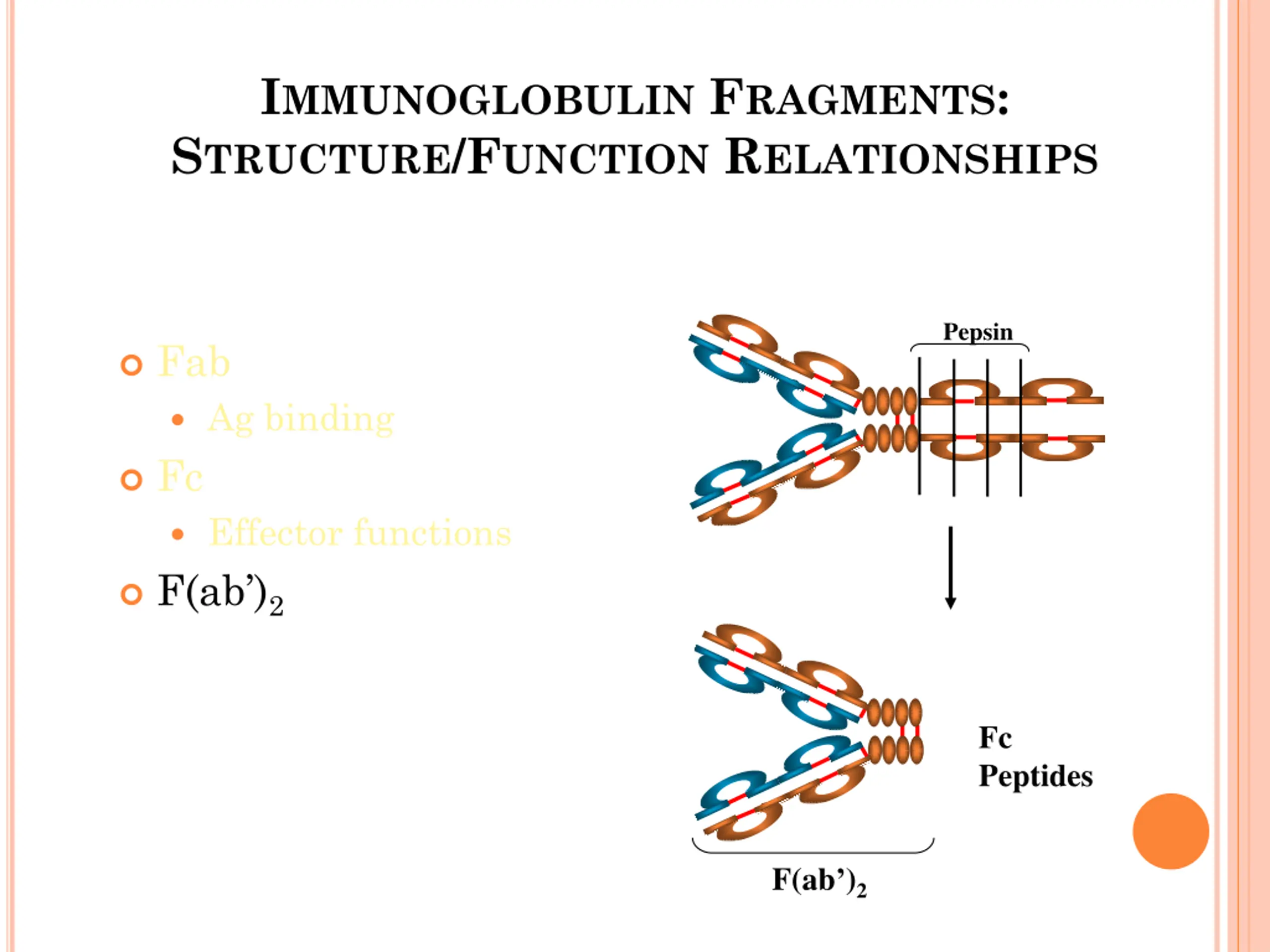 IMMUNOGLOBULIN FRAGMENTS: STRUCTURE/FUNCTION RELATIONSHIPS Pepsin Fab Ag binding Fc Effector functions F(ab )2 Fc Peptides F(ab )2