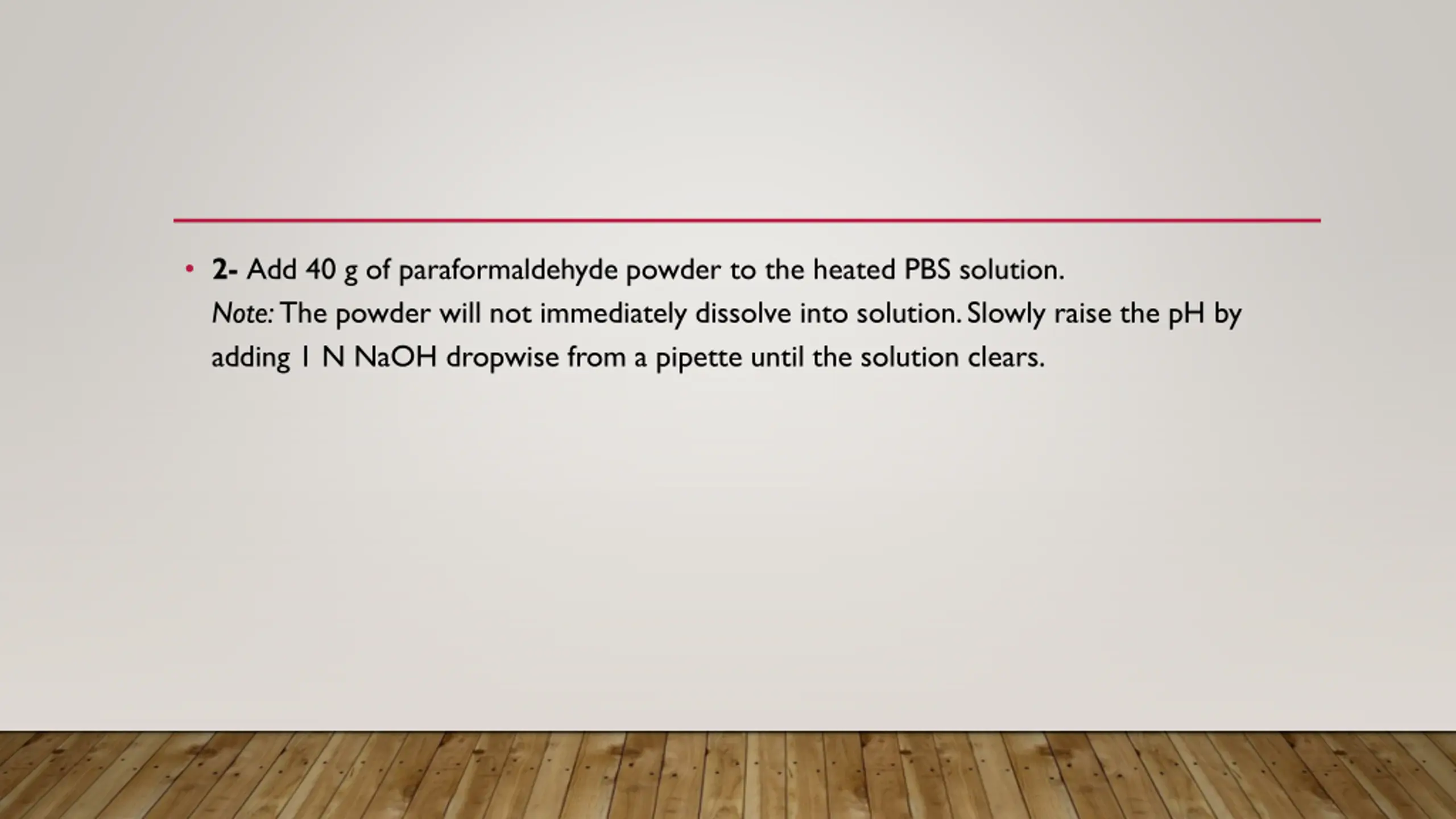 2- Add 40 g of paraformaldehyde powder to the heated PBS solution. Note: The powder will not immediately dissolve into solution. Slowly raise the pH by adding 1 N NaOH dropwise from a pipette until the solution clears.