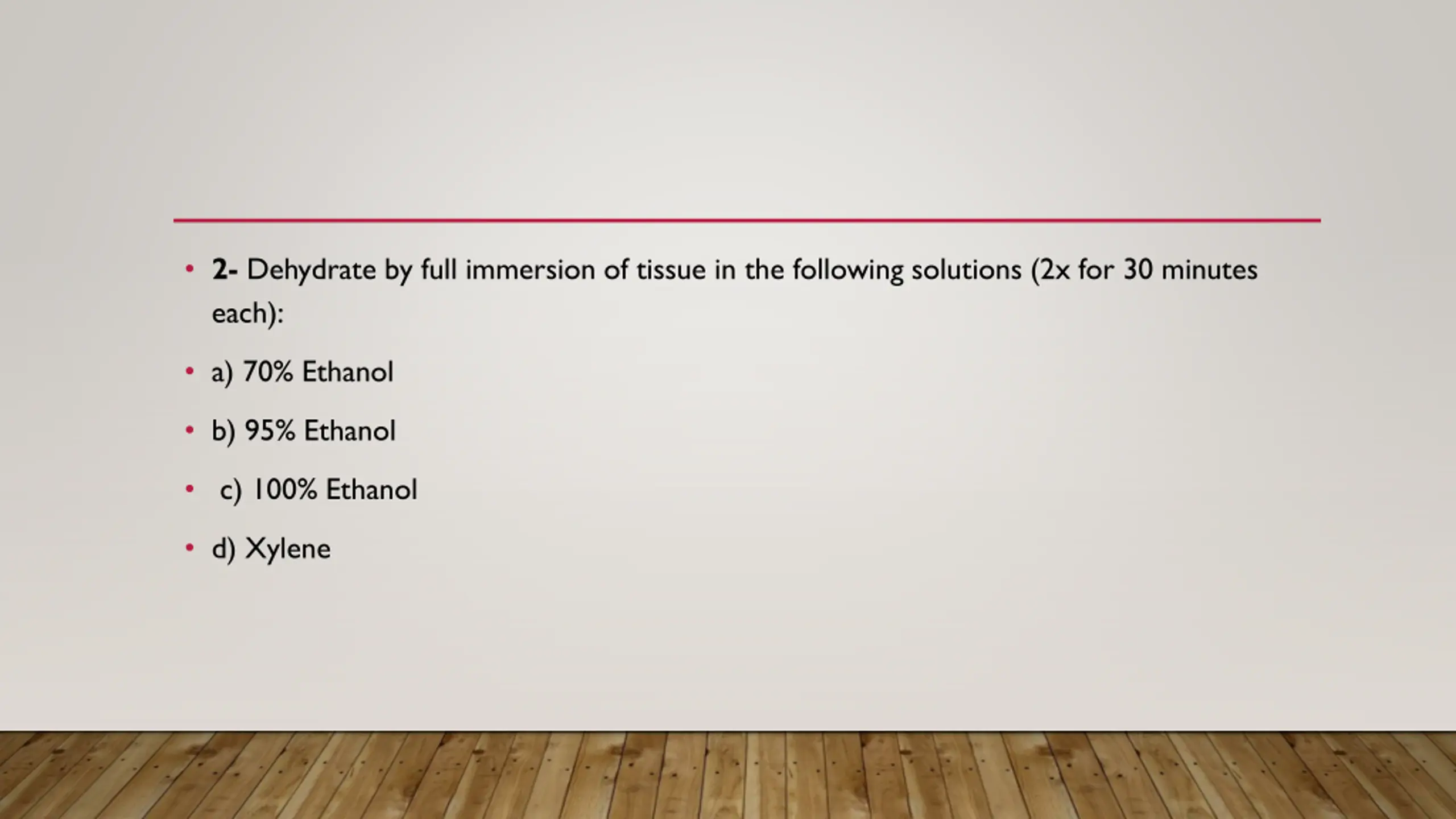 2- Dehydrate by full immersion of tissue in the following solutions (2x for 30 minutes each): a) 70% Ethanol b) 95% Ethanol c) 100% Ethanol d) Xylene