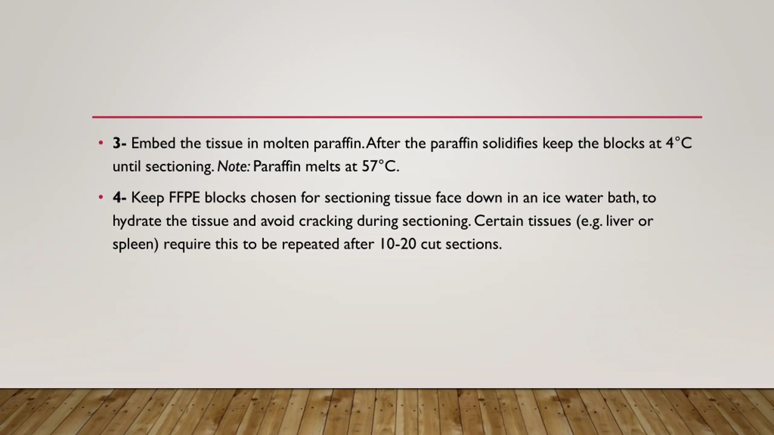 3- Embed the tissue in molten paraffin. After the paraffin solidifies keep the blocks at 4C until sectioning. Note: Paraffin melts at 57 C. 4- Keep FFPE blocks chosen for sectioning tissue face down in an ice water bath, to hydrate the tissue and avoid cracking during sectioning. Certain tissues (e.g. liver or spleen) require this to be repeated after 10-20 cut sections.