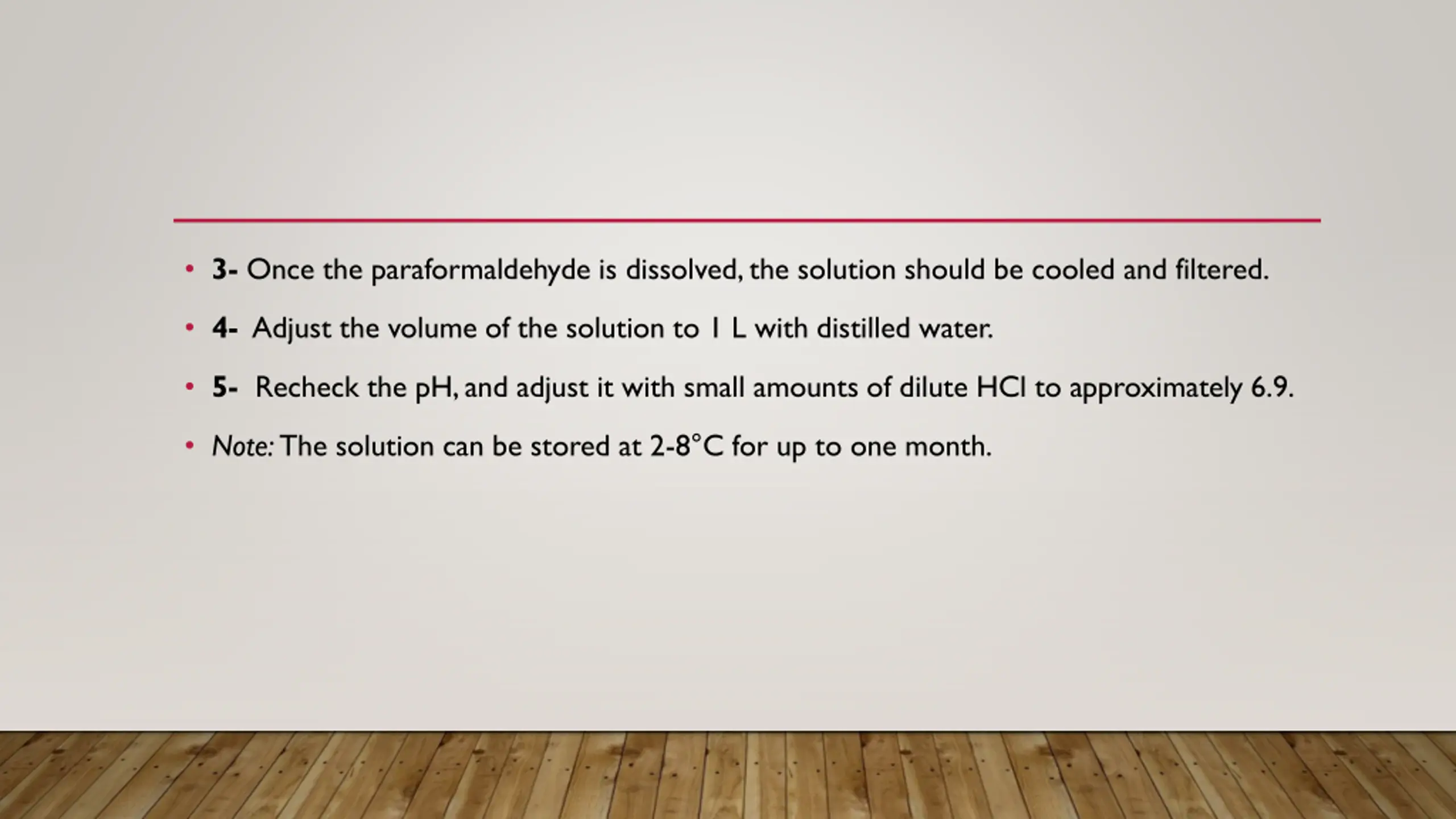 3- Once the paraformaldehyde is dissolved, the solution should be cooled and filtered. 4- Adjust the volume of the solution to 1 L with distilled water. 5- Recheck the pH, and adjust it with small amounts of dilute HCl to approximately 6.9. Note: The solution can be stored at 2-8 C for up to one month.