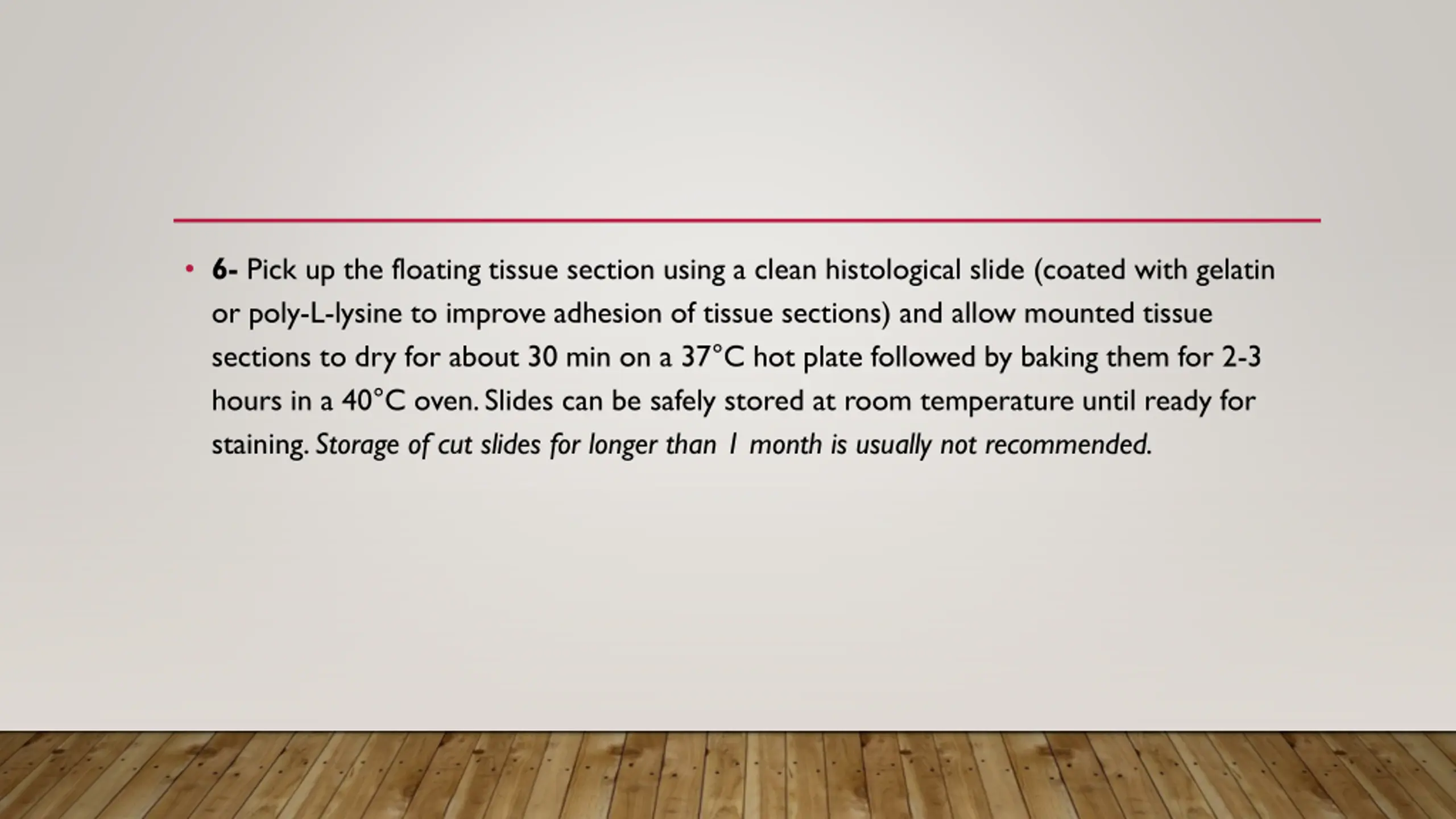 6- Pick up the floating tissue section using a clean histological slide (coated with gelatin or poly-L-lysine to improve adhesion of tissue sections) and allow mounted tissue sections to dry for about 30 min on a 37 C hot plate followed by baking them for 2-3 hours in a 40 C oven. Slides can be safely stored at room temperature until ready for staining. Storage of cut slides for longer than 1 month is usually not recommended.