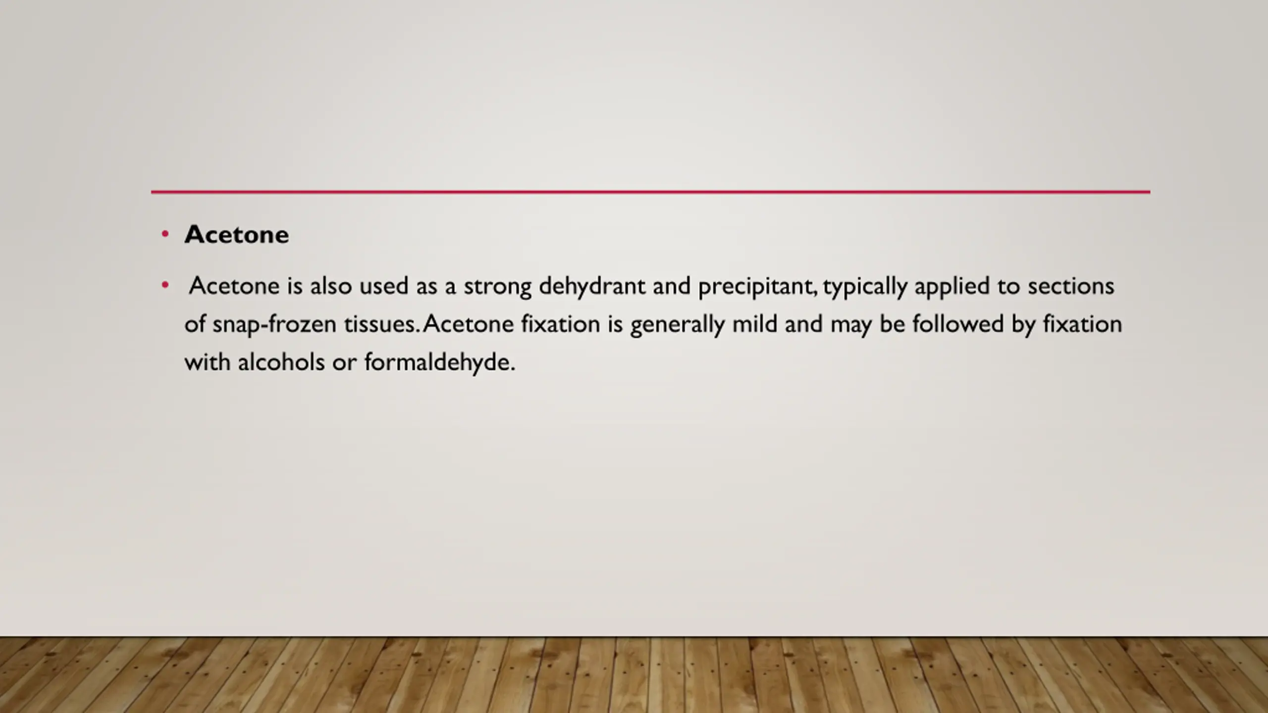 Acetone Acetone is also used as a strong dehydrant and precipitant, typically applied to sections of snap-frozen tissues. Acetone fixation is generally mild and may be followed by fixation with alcohols or formaldehyde.