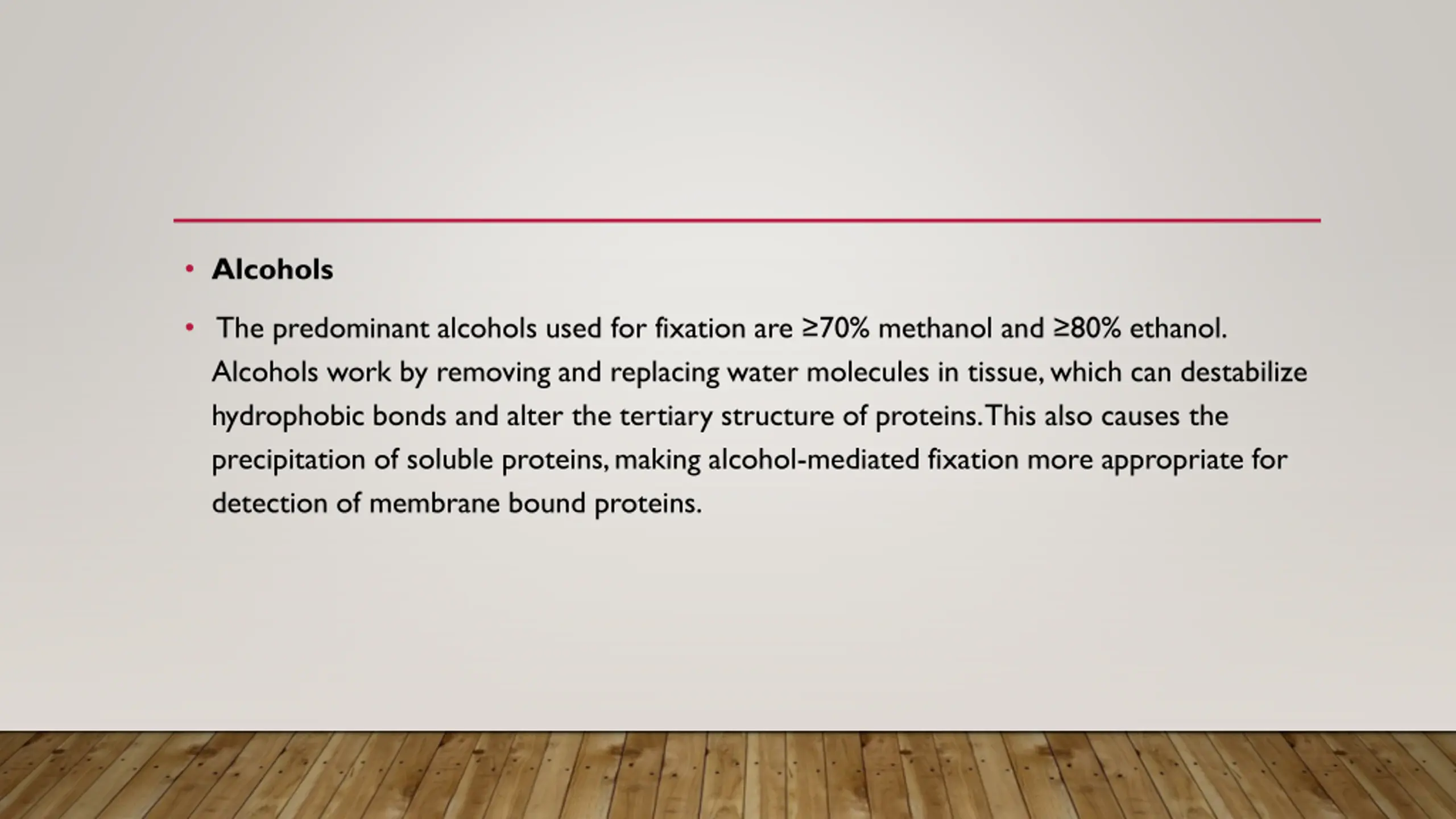 Alcohols The predominant alcohols used for fixation are 70% methanol and 80% ethanol. Alcohols work by removing and replacing water molecules in tissue, which can destabilize hydrophobic bonds and alter the tertiary structure of proteins. This also causes the precipitation of soluble proteins, making alcohol-mediated fixation more appropriate for detection of membrane bound proteins.
