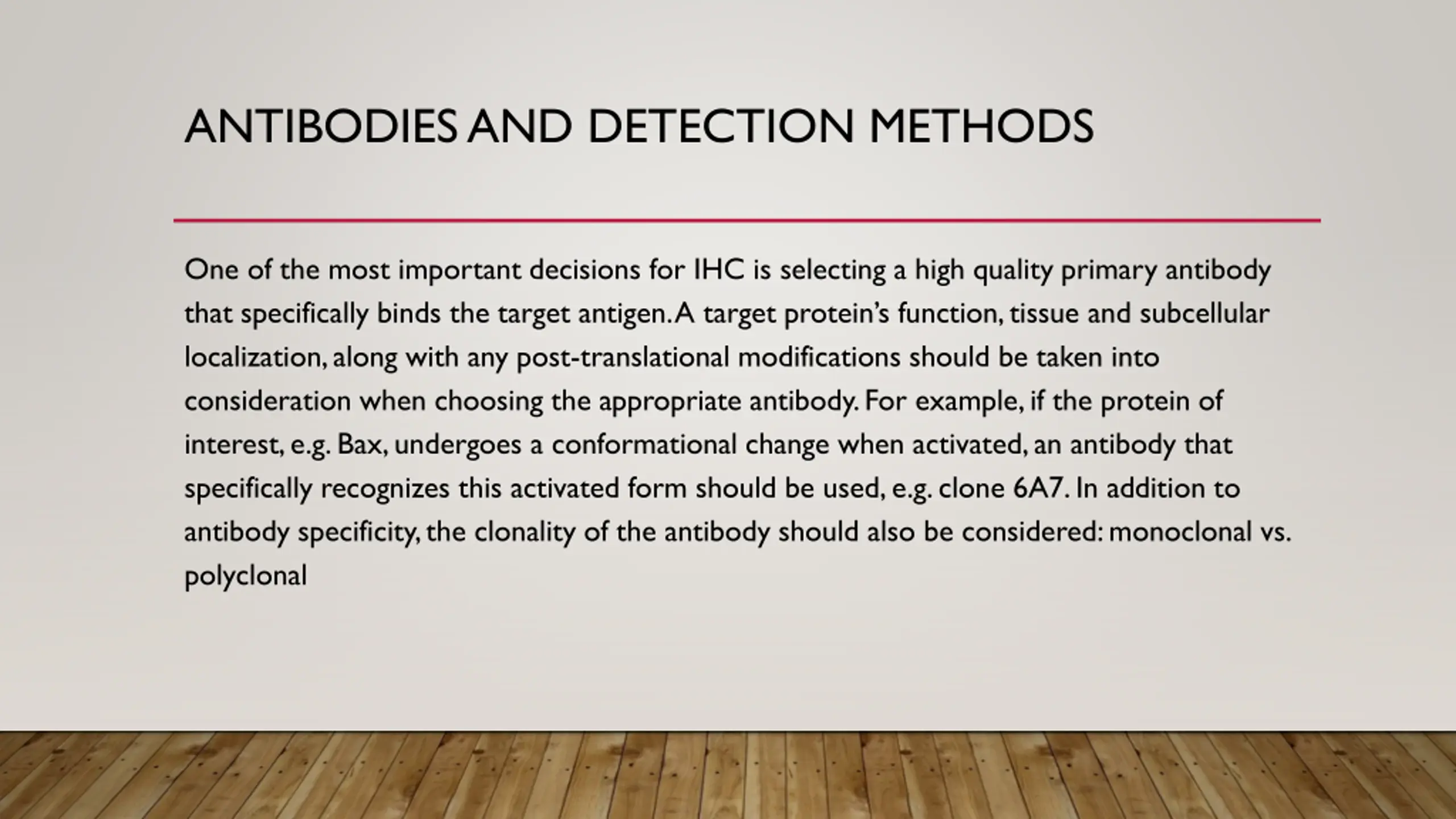 ANTIBODIES AND DETECTION METHODS One of the most important decisions for IHC is selecting a high quality primary antibody that specifically binds the target antigen. A target protein s function, tissue and subcellular localization, along with any post-translational modifications should be taken into consideration when choosing the appropriate antibody. For example, if the protein of interest, e.g. Bax, undergoes a conformational change when activated, an antibody that specifically recognizes this activated form should be used, e.g. clone 6A7. In addition to antibody specificity, the clonality of the antibody should also be considered: monoclonal vs. polyclonal