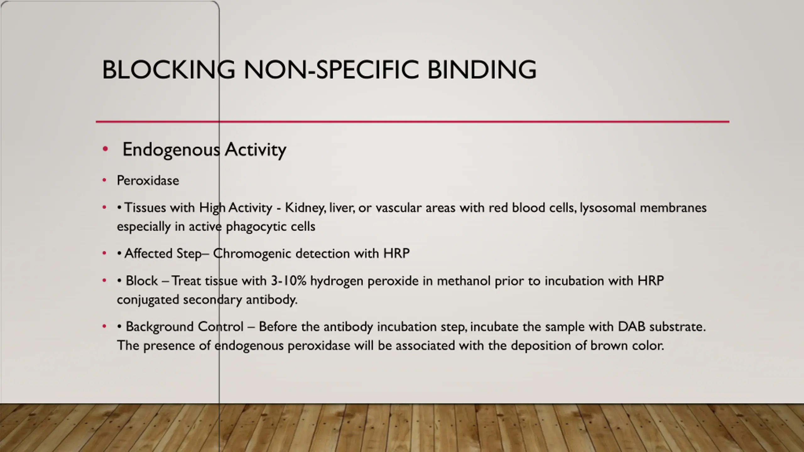 BLOCKING NON-SPECIFIC BINDING Endogenous Activity Peroxidase Tissues with High Activity - Kidney, liver, or vascular areas with red blood cells, lysosomal membranes especially in active phagocytic cells Affected Step Chromogenic detection with HRP Block Treat tissue with 3-10% hydrogen peroxide in methanol prior to incubation with HRP conjugated secondary antibody. Background Control Before the antibody incubation step, incubate the sample with DAB substrate. The presence of endogenous peroxidase will be associated with the deposition of brown color.