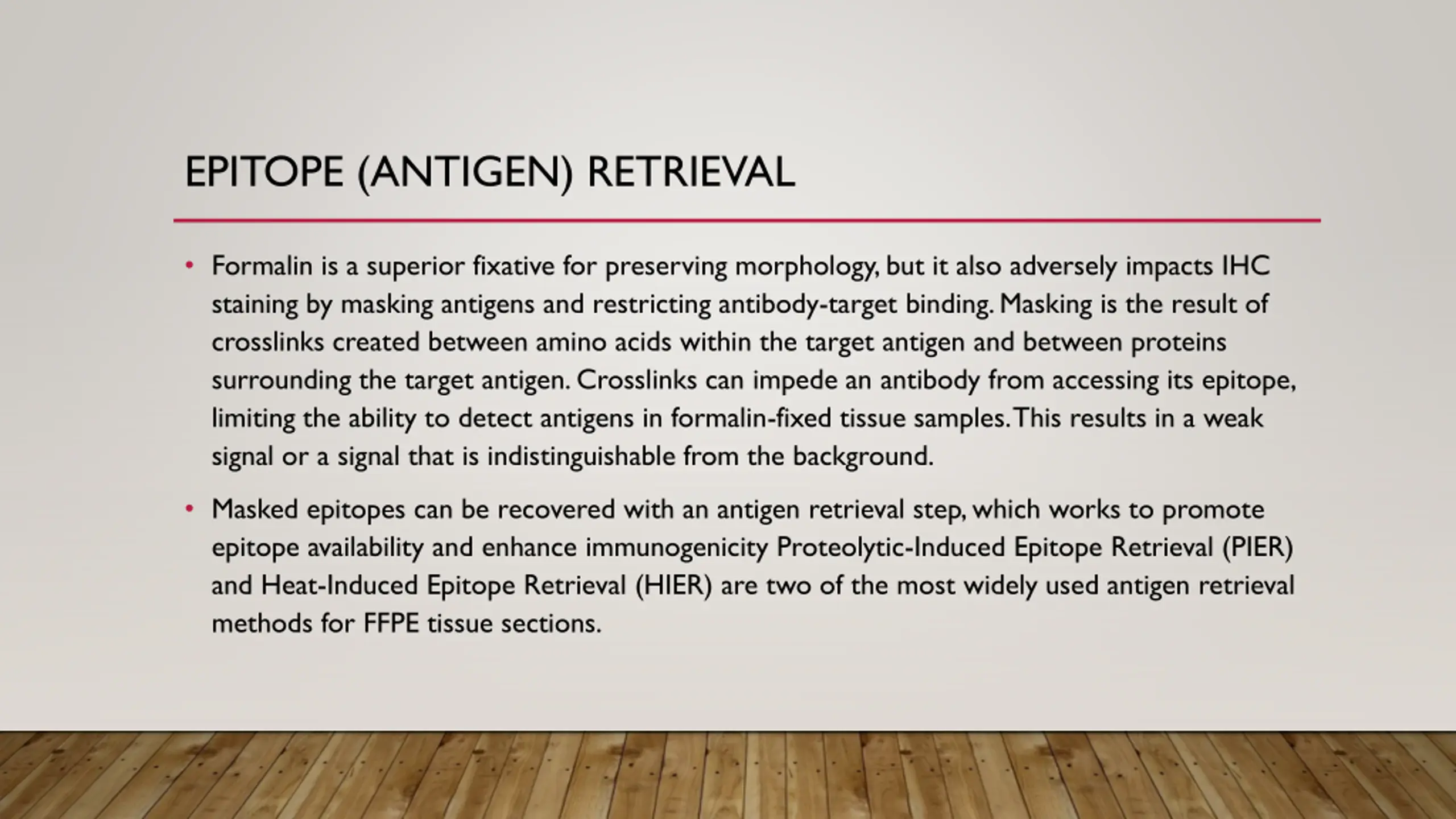 EPITOPE (ANTIGEN) RETRIEVAL Formalin is a superior fixative for preserving morphology, but it also adversely impacts IHC staining by masking antigens and restricting antibody-target binding. Masking is the result of crosslinks created between amino acids within the target antigen and between proteins surrounding the target antigen. Crosslinks can impede an antibody from accessing its epitope, limiting the ability to detect antigens in formalin-fixed tissue samples. This results in a weak signal or a signal that is indistinguishable from the background. Masked epitopes can be recovered with an antigen retrieval step, which works to promote epitope availability and enhance immunogenicity Proteolytic-Induced Epitope Retrieval (PIER) and Heat-Induced Epitope Retrieval (HIER) are two of the most widely used antigen retrieval methods for FFPE tissue sections.