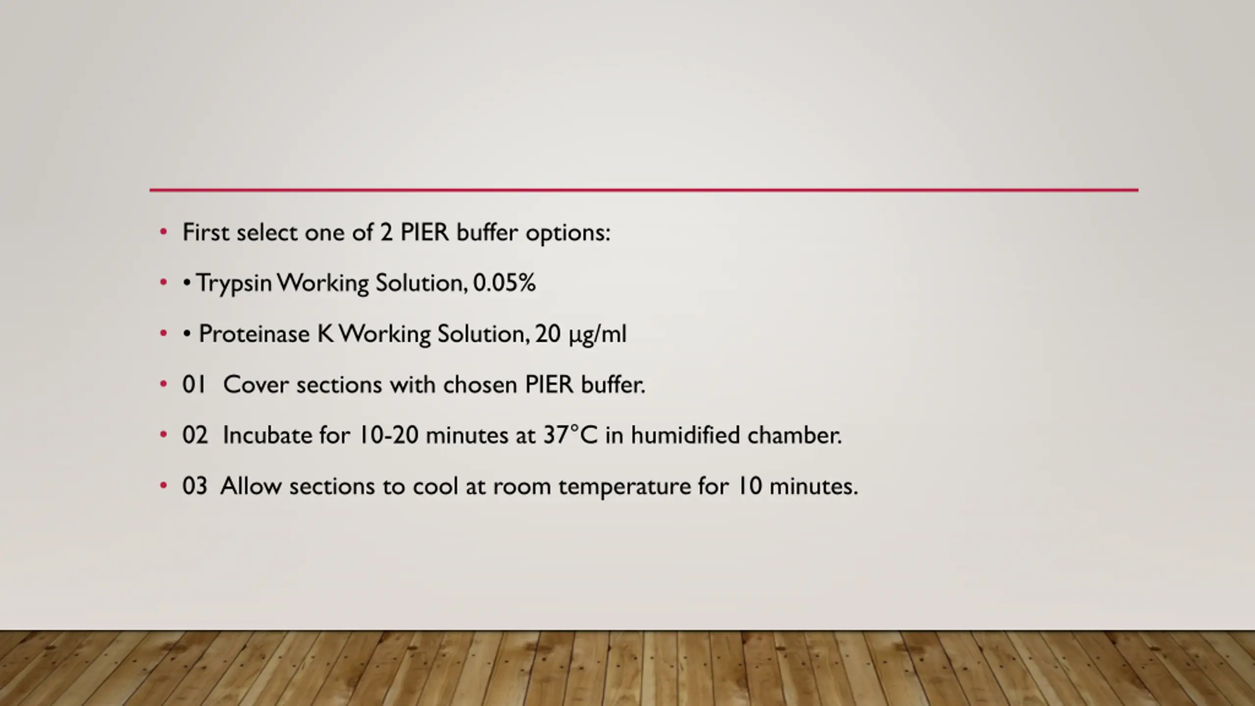 First select one of 2 PIER buffer options: Trypsin Working Solution, 0.05% Proteinase K Working Solution, 20 g/ml 01 Cover sections with chosen PIER buffer. 02 Incubate for 10-20 minutes at 37 C in humidified chamber. 03 Allow sections to cool at room temperature for 10 minutes.