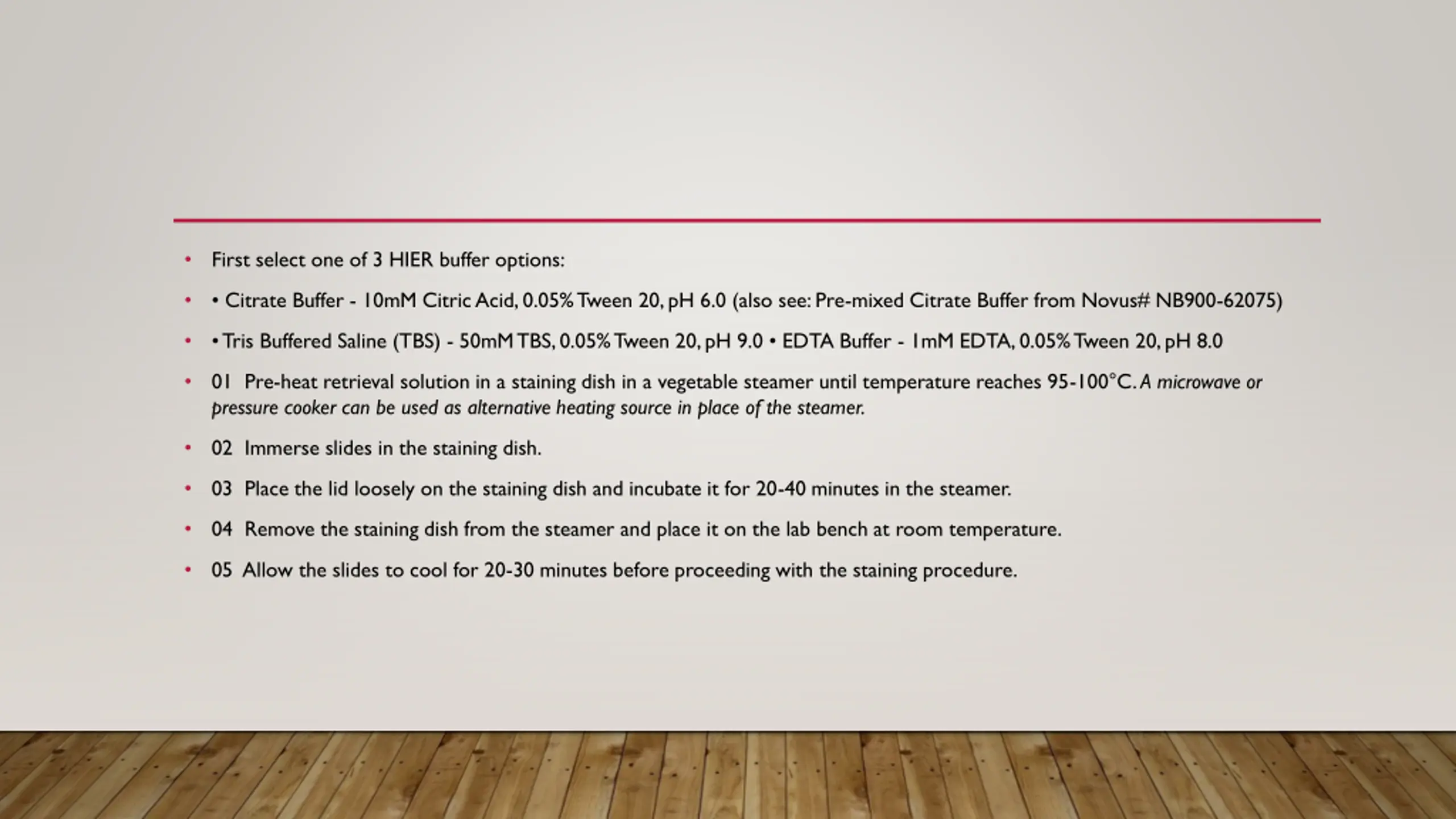 First select one of 3 HIER buffer options: Citrate Buffer - 10mM Citric Acid, 0.05% Tween 20, pH 6.0 (also see: Pre-mixed Citrate Buffer from Novus# NB900-62075) Tris Buffered Saline (TBS) - 50mM TBS, 0.05% Tween 20, pH 9.0 EDTA Buffer - 1mM EDTA, 0.05% Tween 20, pH 8.0 01 Pre-heat retrieval solution in a staining dish in a vegetable steamer until temperature reaches 95-100 C. A microwave or pressure cooker can be used as alternative heating source in place of the steamer. 02 Immerse slides in the staining dish. 03 Place the lid loosely on the staining dish and incubate it for 20-40 minutes in the steamer. 04 Remove the staining dish from the steamer and place it on the lab bench at room temperature. 05 Allow the slides to cool for 20-30 minutes before proceeding with the staining procedure.
